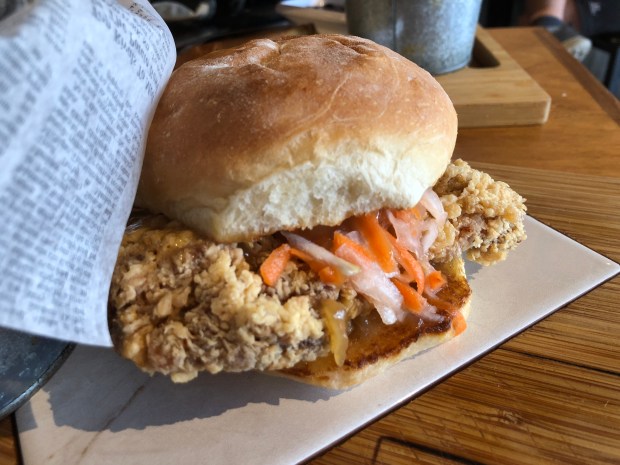 Pollo Chi Jao Kai – Oriental marinade crispy fried chicken thigh with pickled turnip and carrots served on their homemade bun.