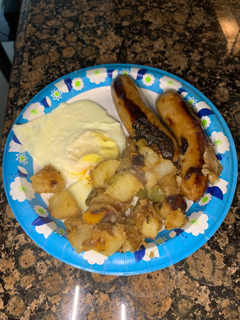 After the shots, we devoured the lovely Irish breakfast my Mom cooked up (bangers, eggs, and potatoes). We bought the bangers at Aldi (they always have festive food for St. Patty’s Day) and just cooked them on a pan.
