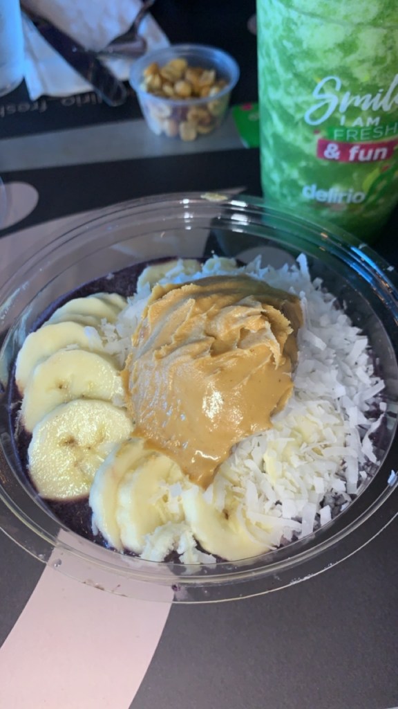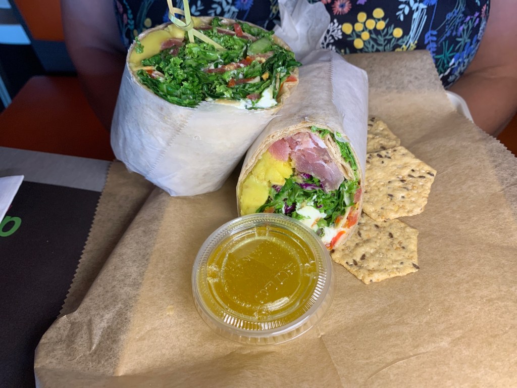 I had not had breakfast and was in the mood for an açaí bowl, so that is what I got. I had the choice of three toppings for the bowl and I chose bananas, peanut butter, and shredded coconut. The açaí bowl was smaller than I expected but it was rather filling. On the other hand, my mom and sister opted to have lunch. They both had the Avocado Tuna Wrap and it was huge. They ate half of it and packed up the rest for my dad’s lunch.