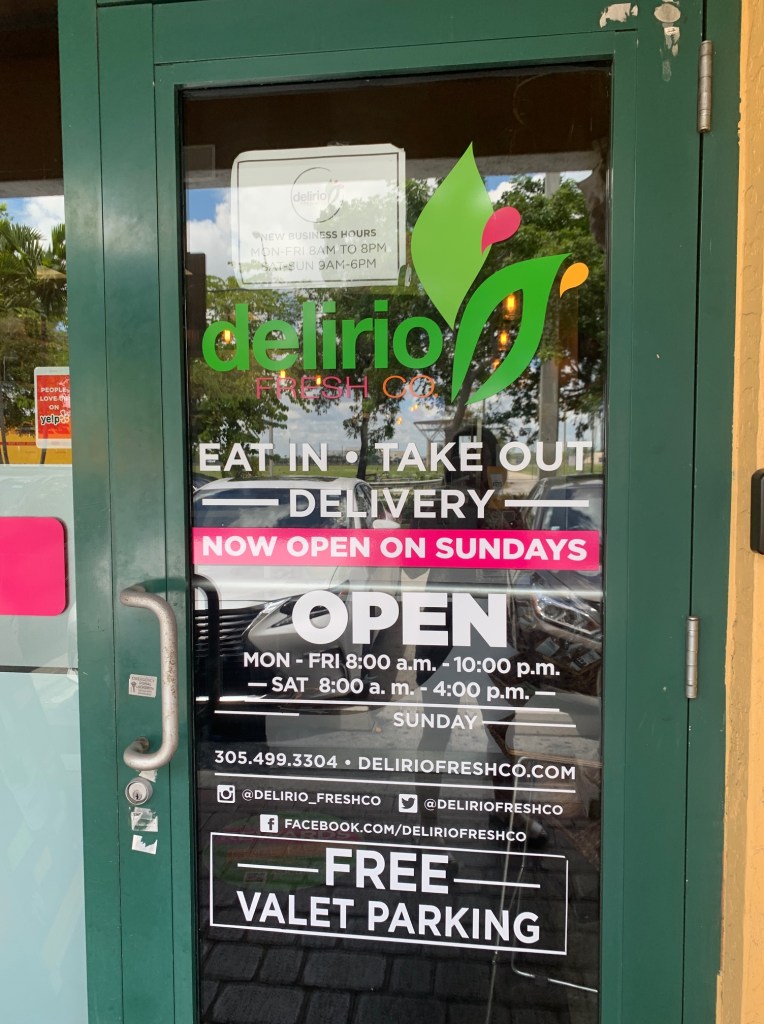 For my mother’s birthday I wanted to try a new spot for breakfast/lunch. I was in the mood for something healthy and refreshing, so I sent my mother Delirio FreshCo‘s menu to see if she would be interested. The variety of healthy options and extensive menu had us all sold. We went around 11PM and successfully avoided the lunch crowd. The parking is not ideal but they do offer free valet parking and there is parking on top of the building.