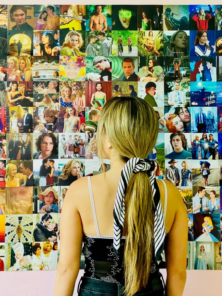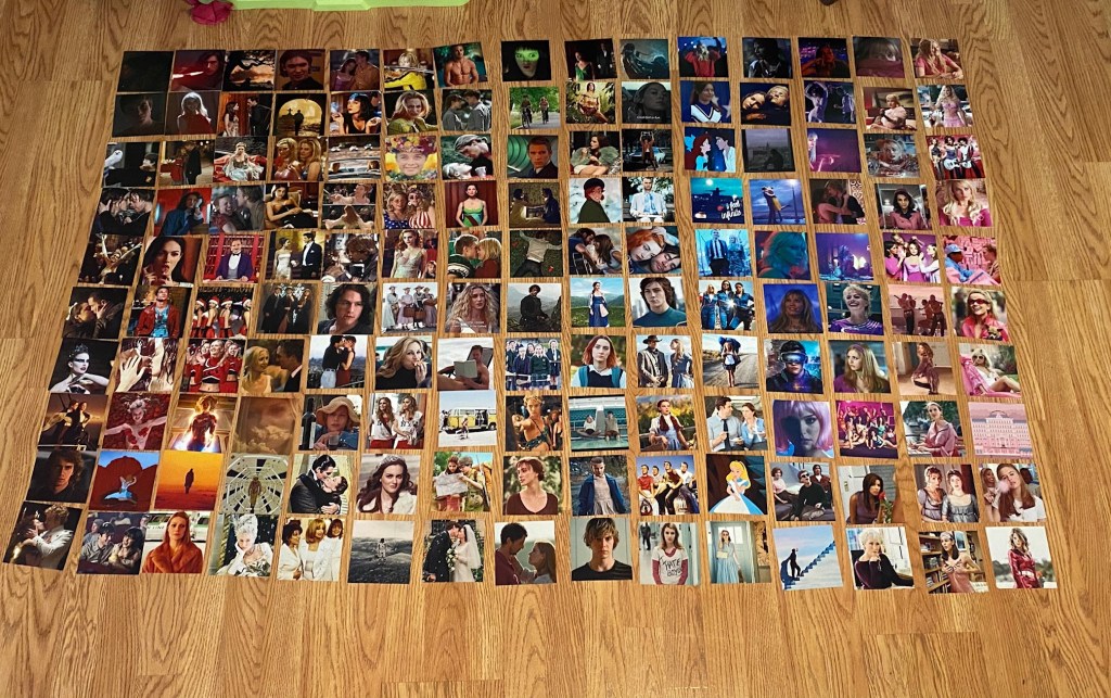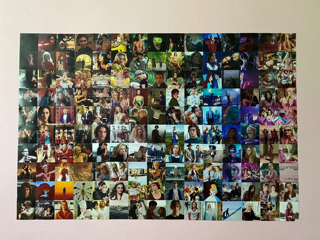 First thing I did was jot down movies/tv shows I wanted to include. I proceeded with googling for the screencaps I wanted (while keeping in my mind I needed a variety of colors). Ultimately, I chose 150 screencaps that would look good 4×4 (and of course, are of good quality). I decided to give Shutterfly a try to print out these bad boys. I spent around $30 and it was worth it. They came out great (however, when I was arranging them, I did realize some were bigger than others, but it is ok, because you can overlap and play around with them).
