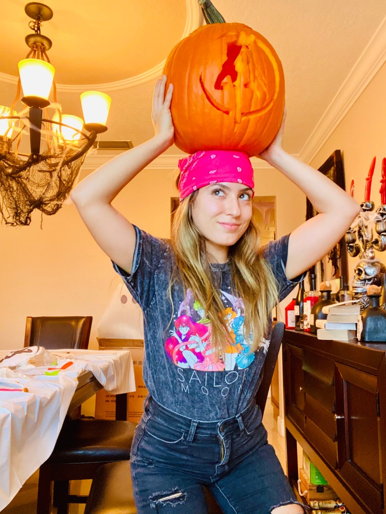 Since I am dressing up as Sailor Moon this year, I wanted to carve a pumpkin to match (just like the time I crafted R2D2 when I dressed as Princess Leia). I found a picture online that I used as a stencil; fyi, it was not the easiest design I had to tweak it a bit and it still needed reinforcement.