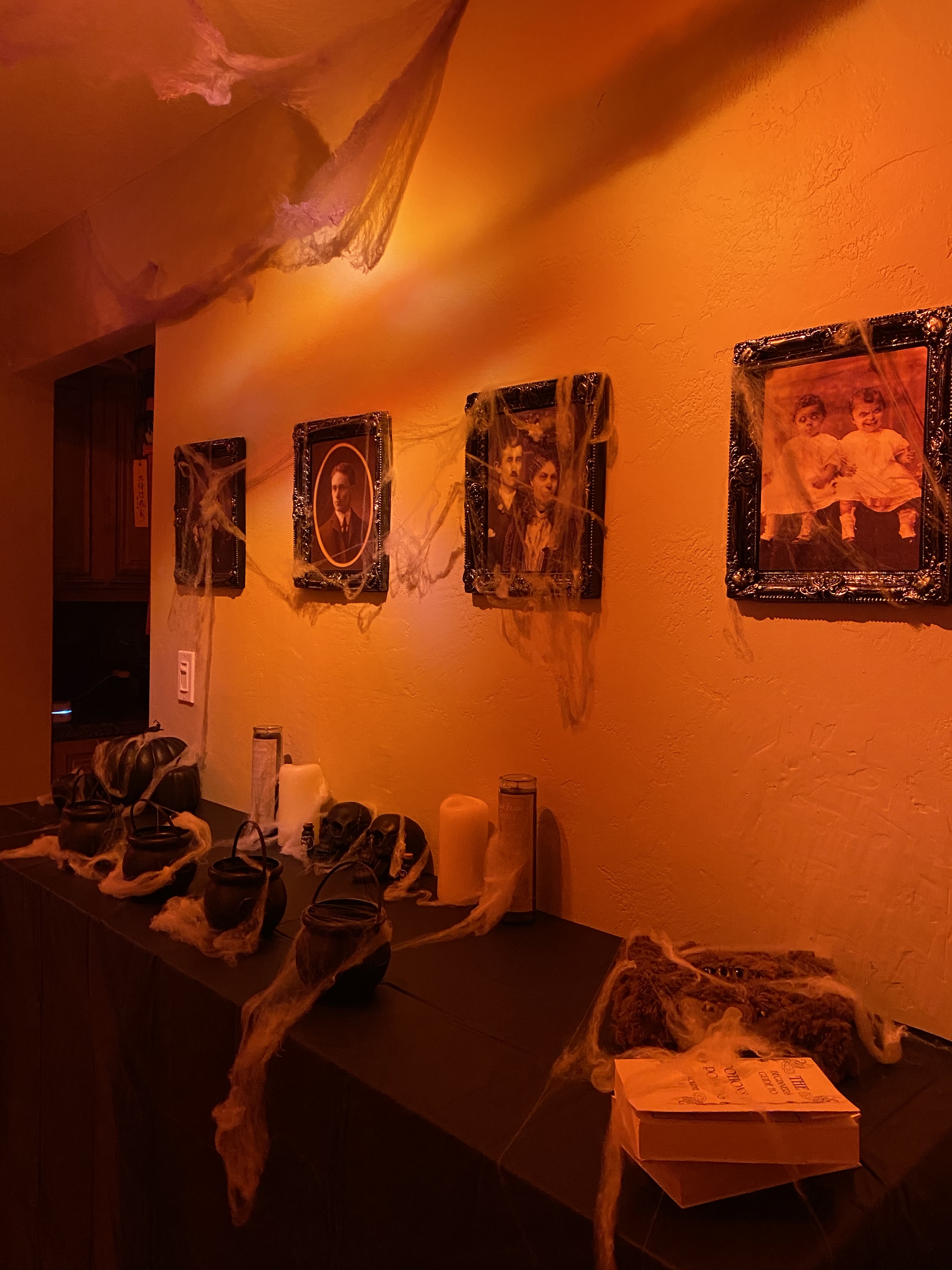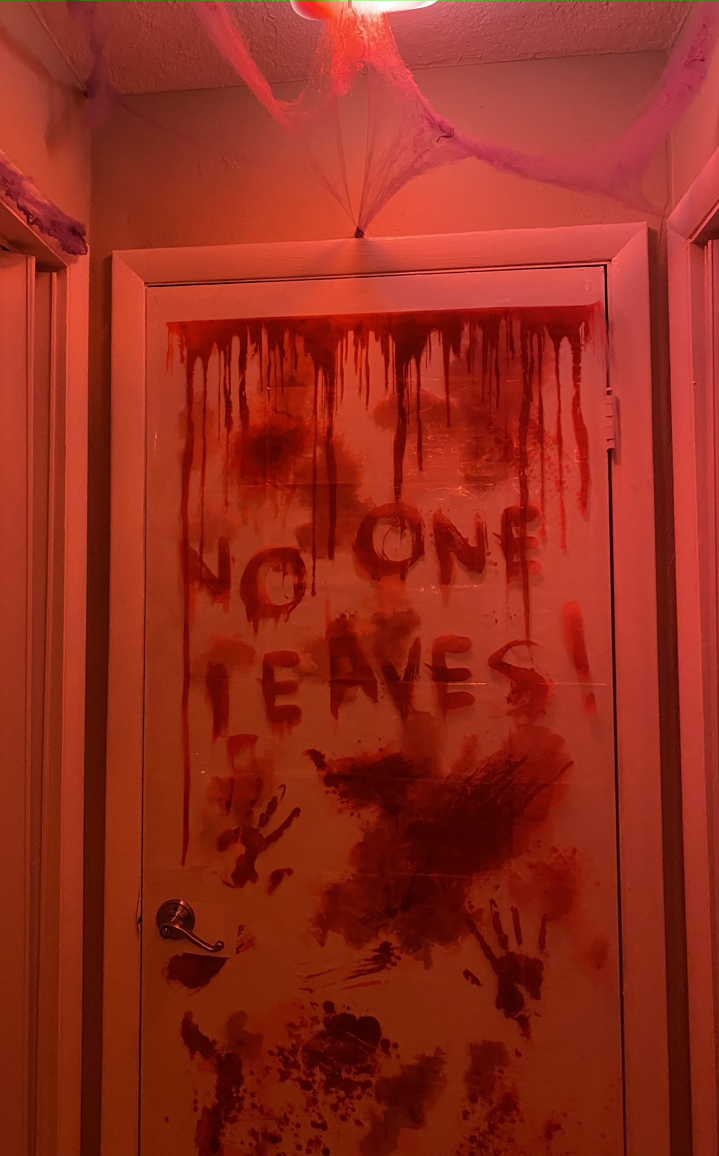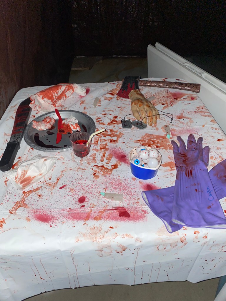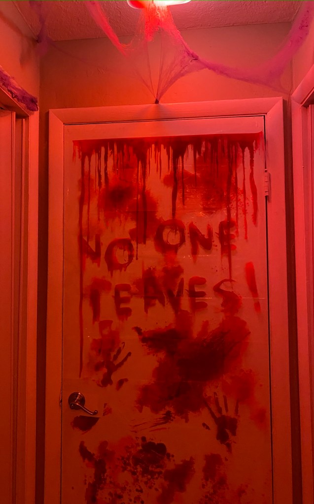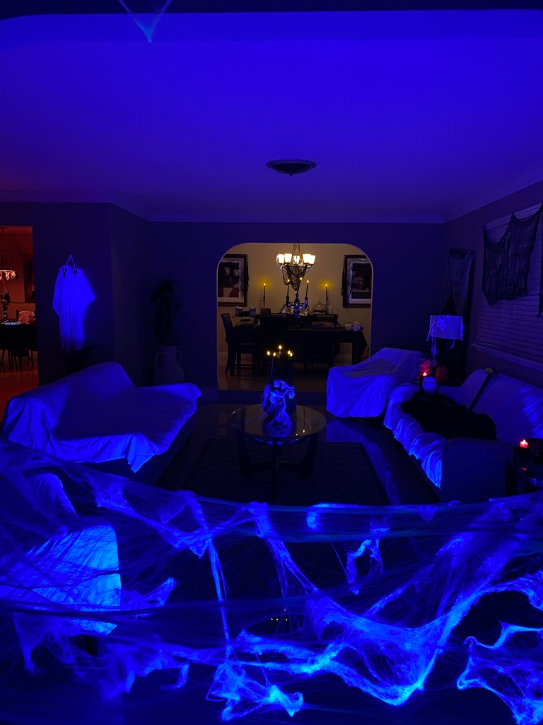 For this, creepy cloths were used for the windows/frames; cobwebs were placed everywhere; mood lighting was utilized; sheets were used to cover the furniture; and a fake body was planted on the couch with a mask.