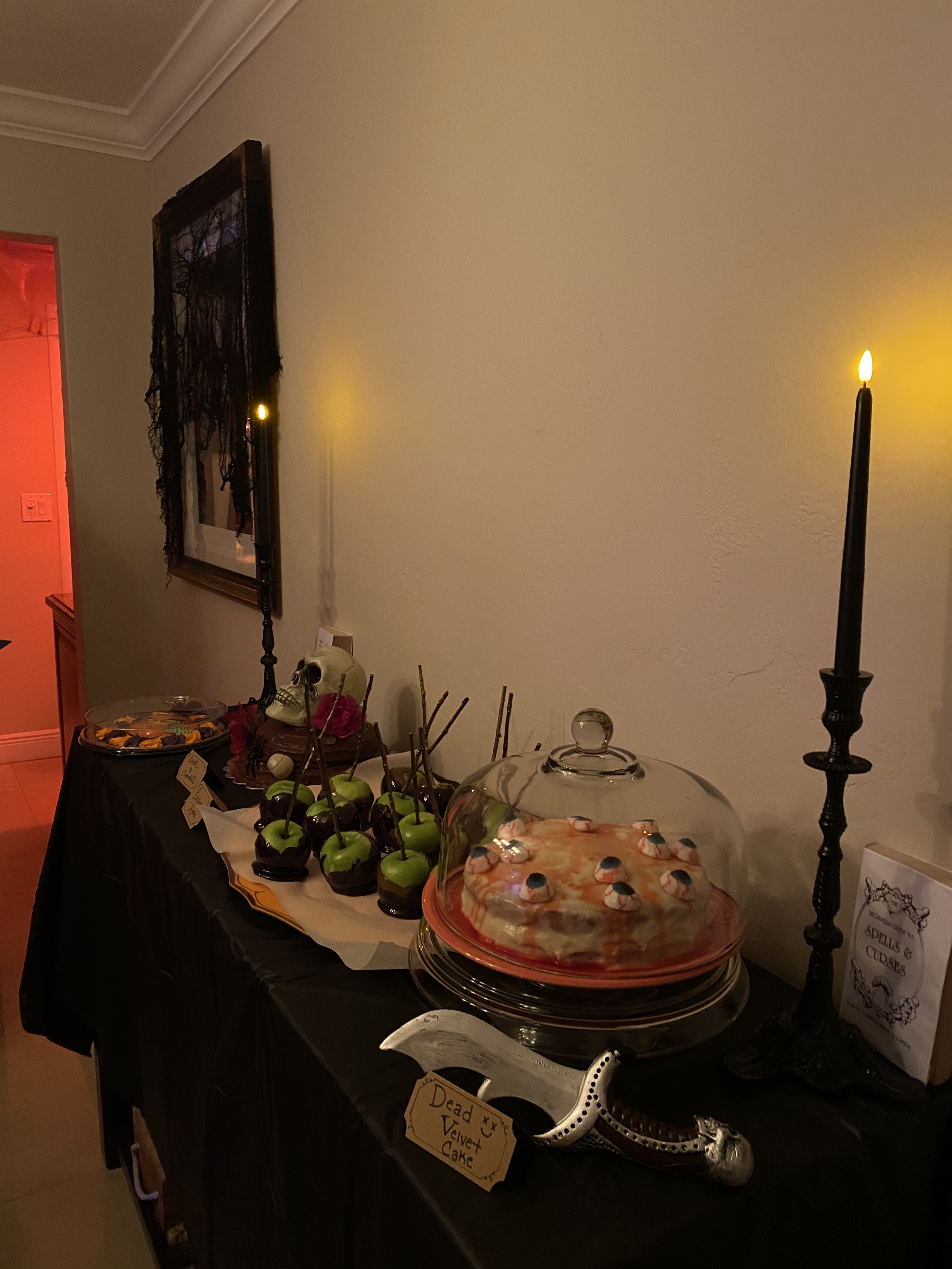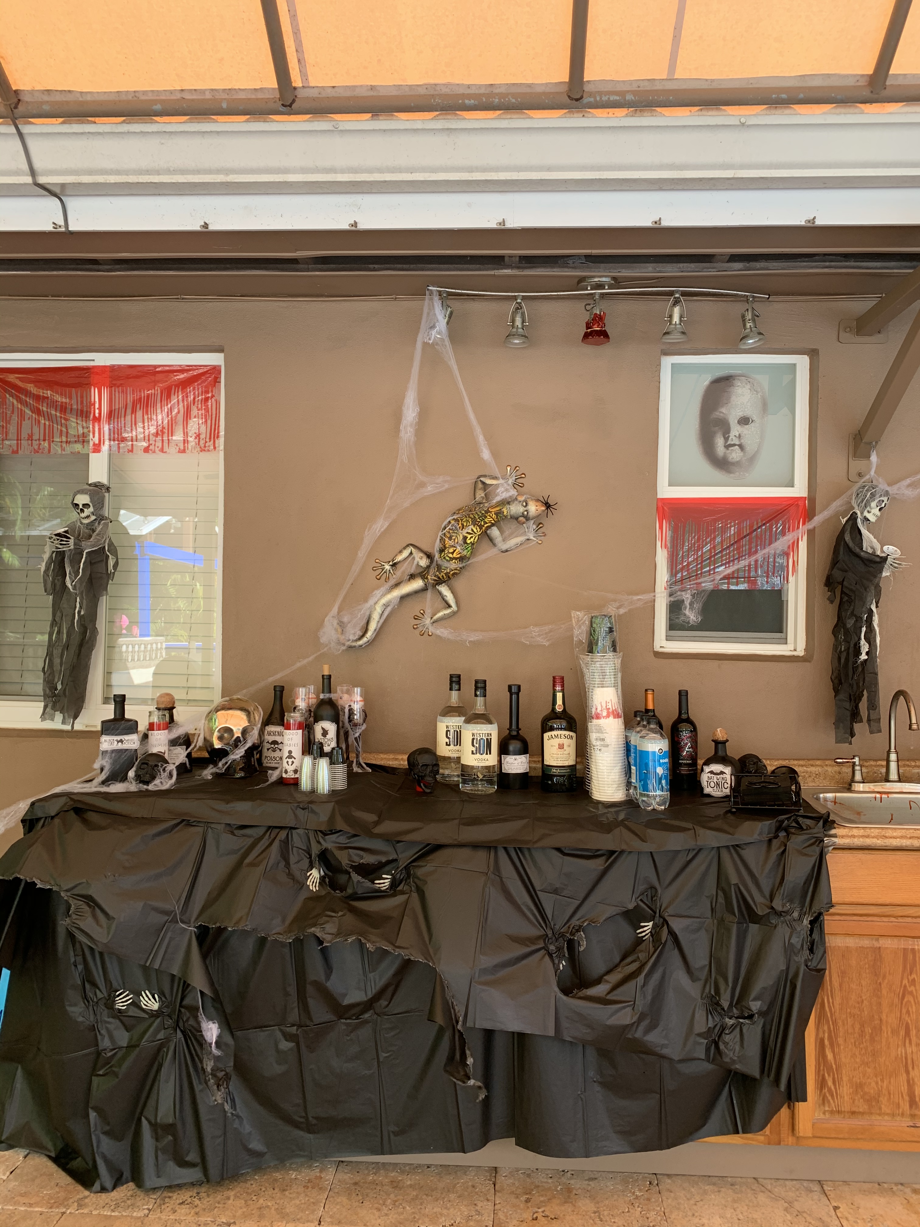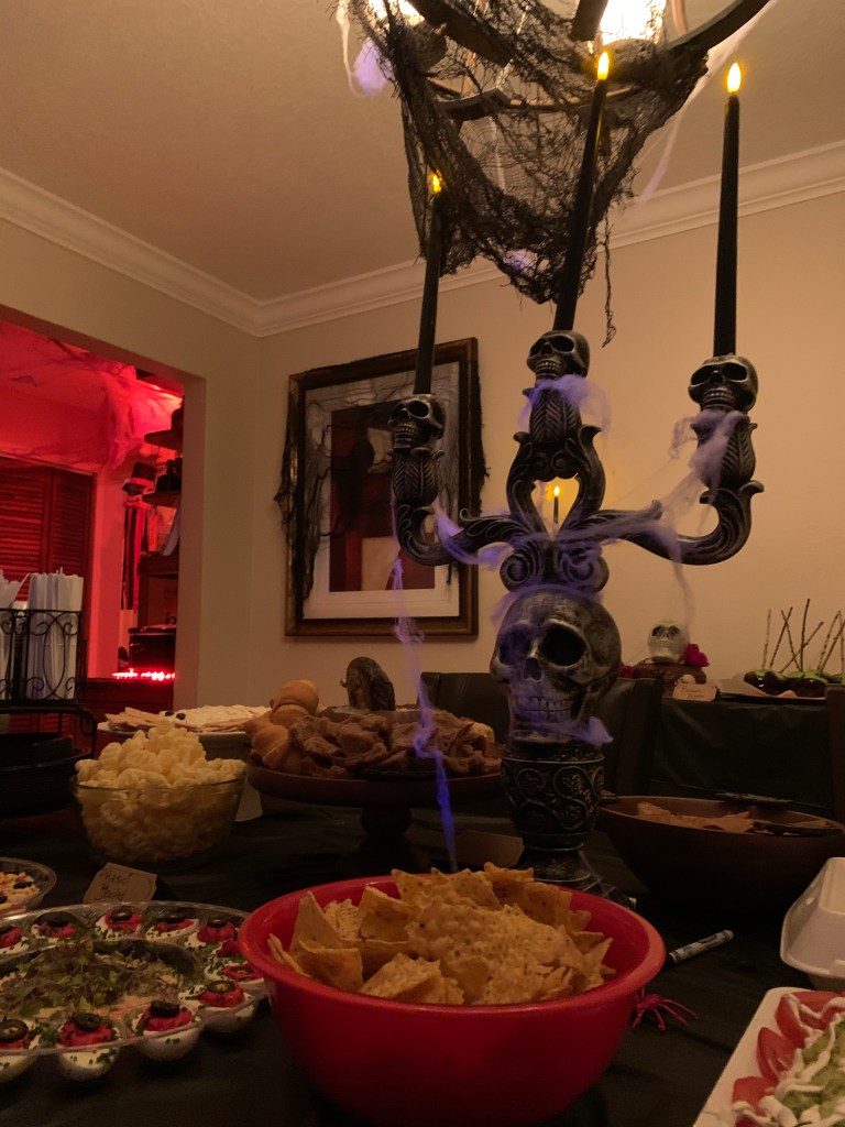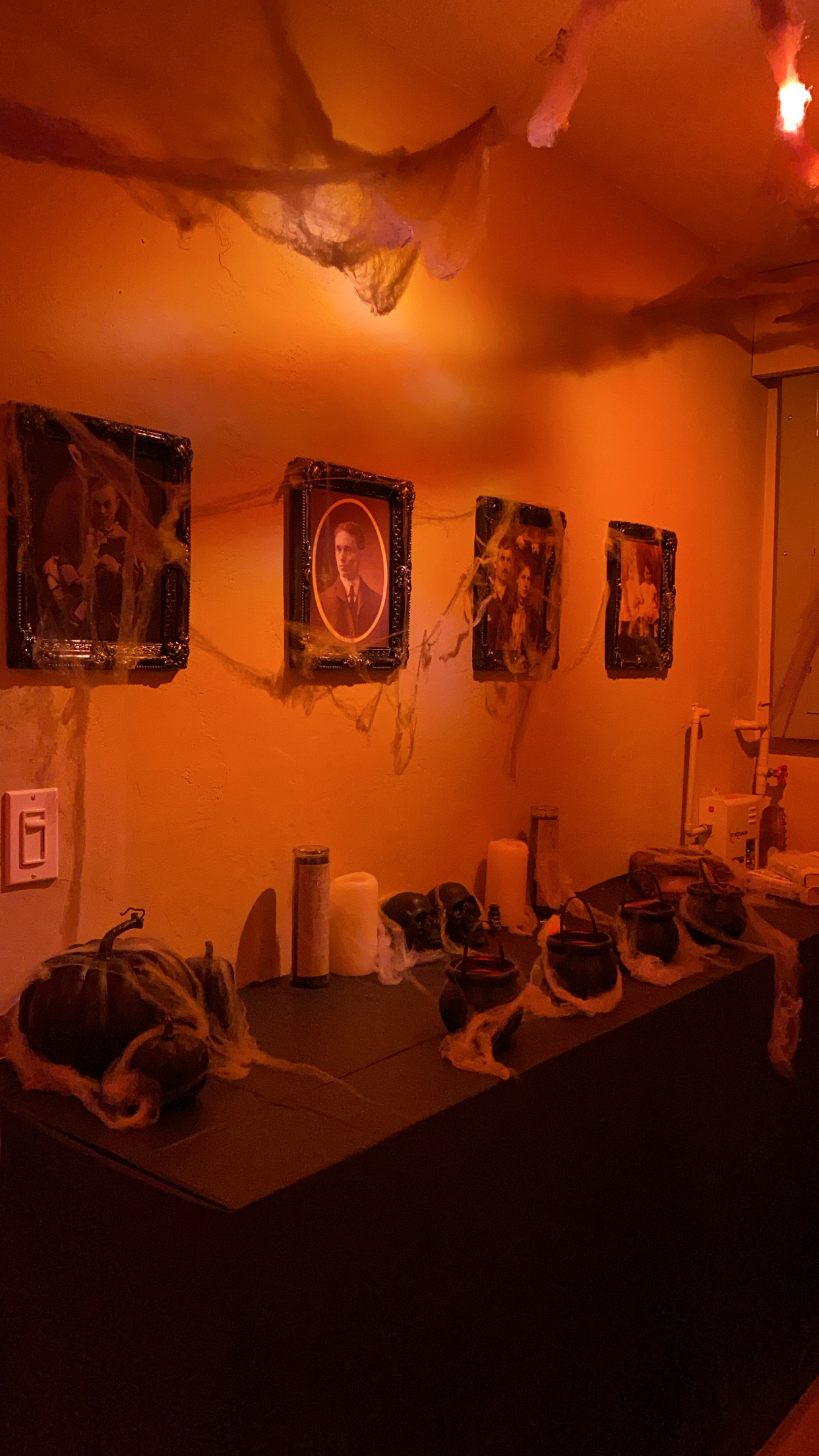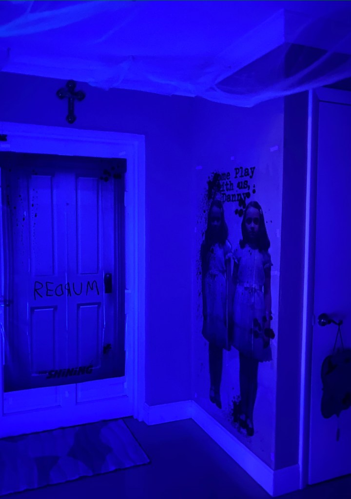 For this, creepy cloths were used for the windows/frames; cobwebs were placed everywhere; mood lighting was utilized; sheets were used to cover the furniture; and a fake body was planted on the couch with a mask.