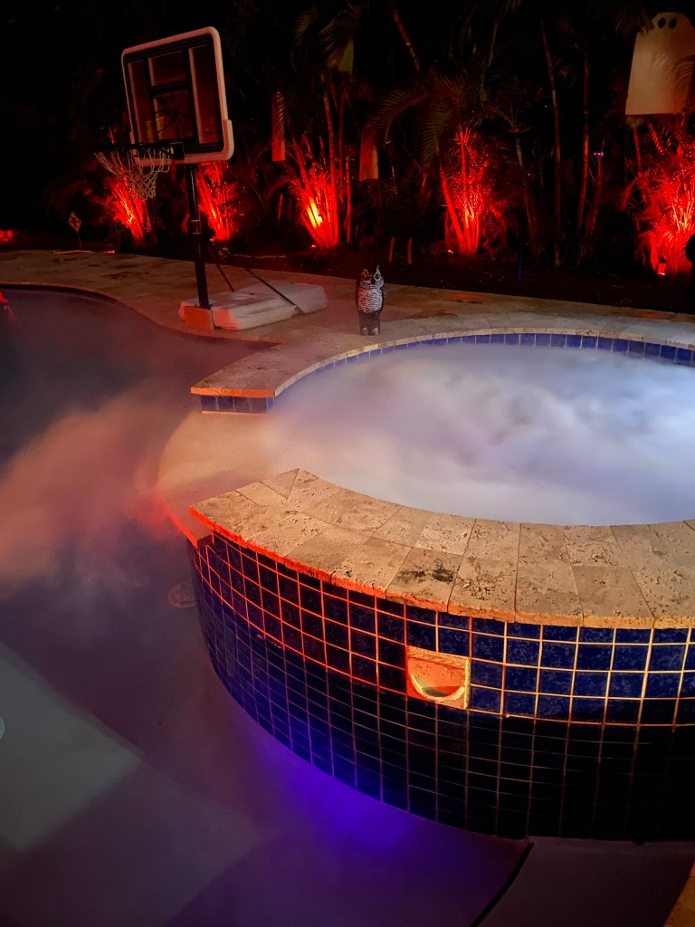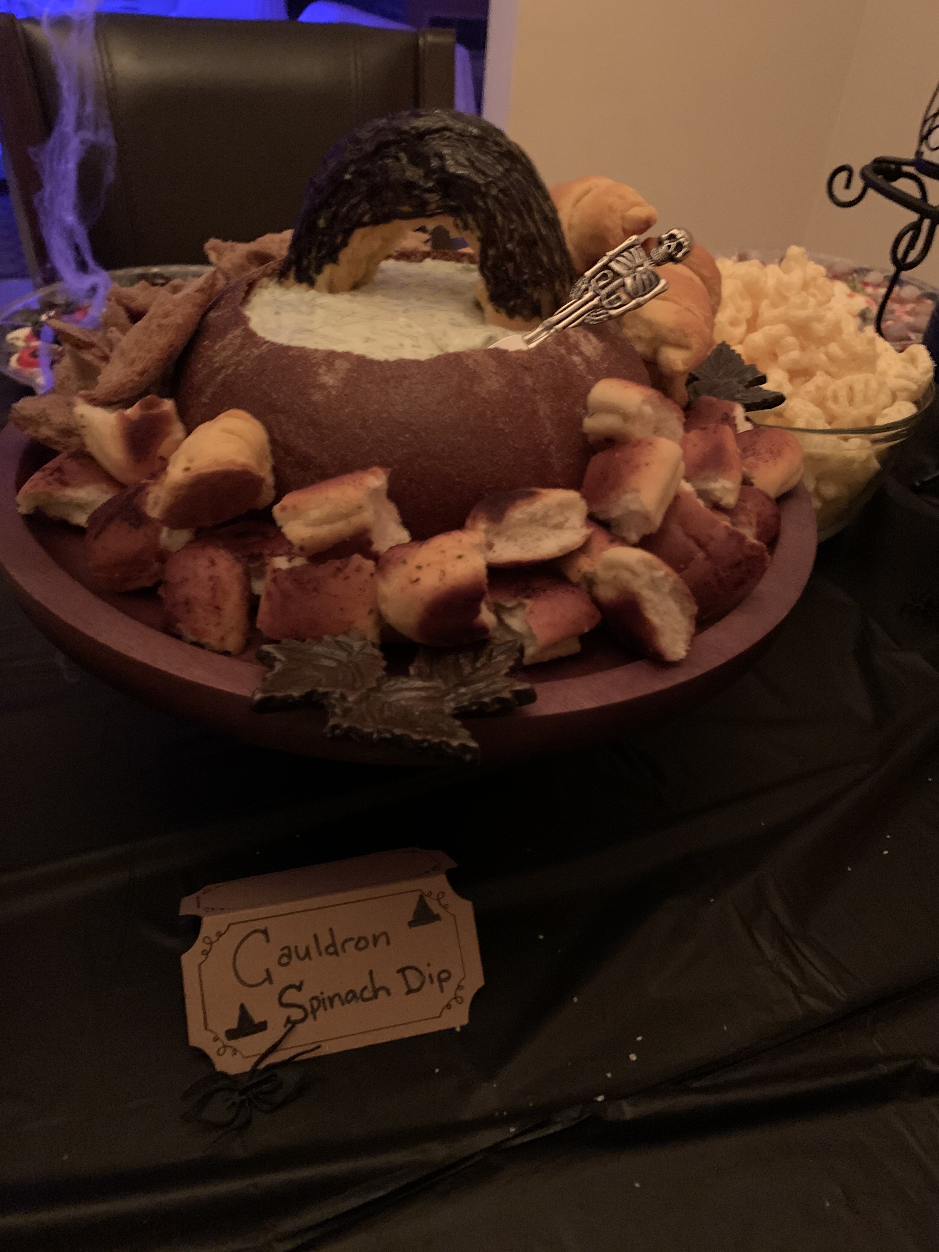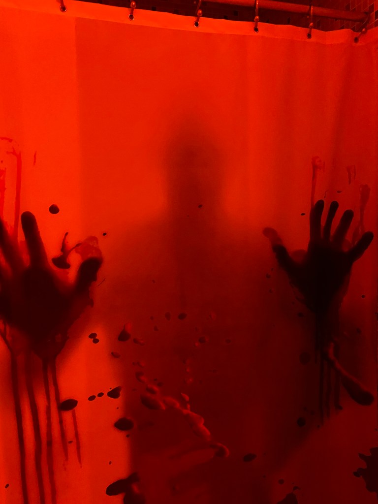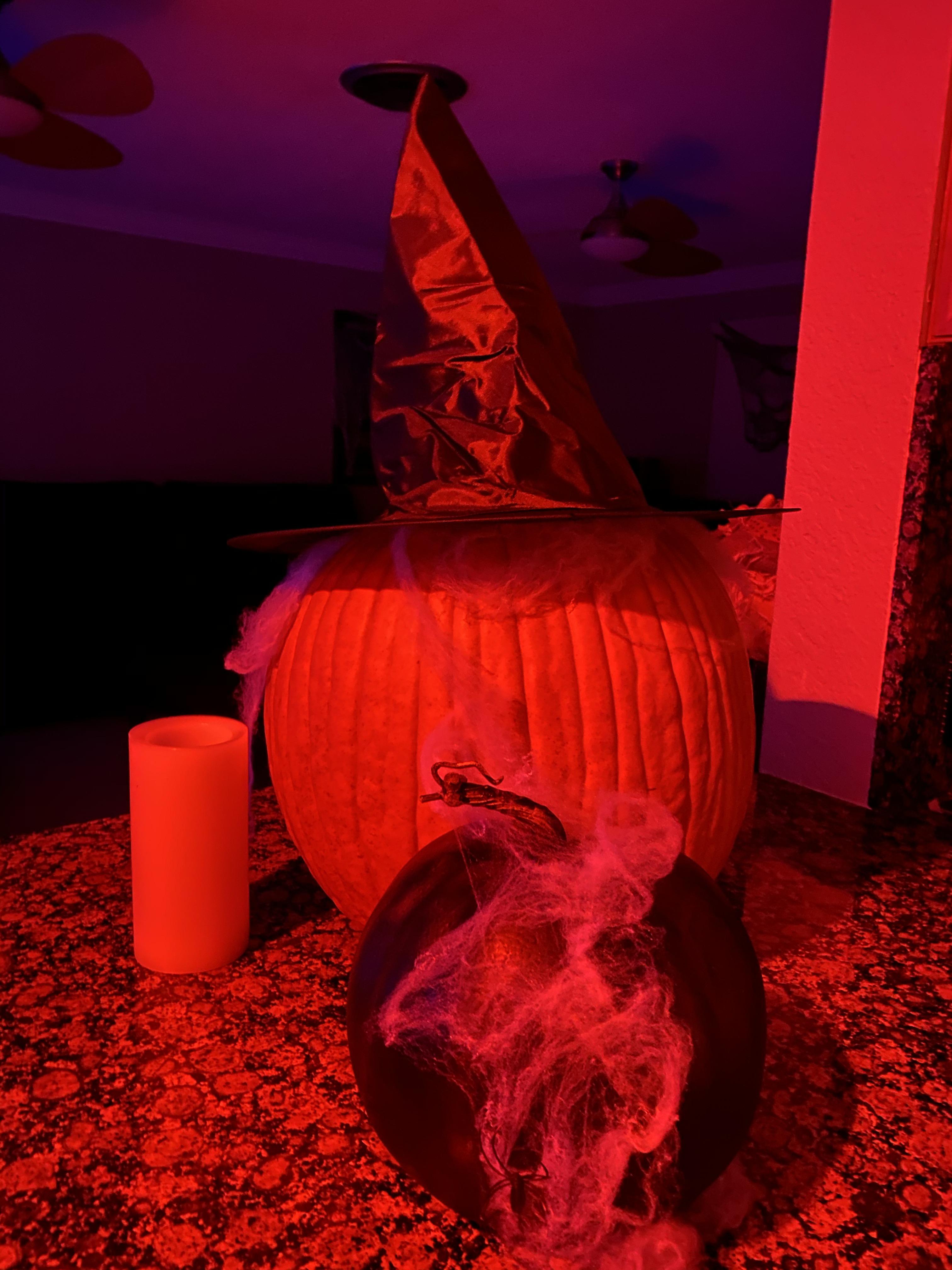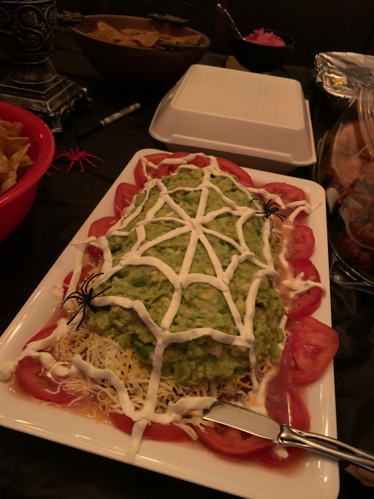 For this, creepy cloths were used for the windows/frames; cobwebs were placed everywhere; mood lighting was utilized; sheets were used to cover the furniture; and a fake body was planted on the couch with a mask.