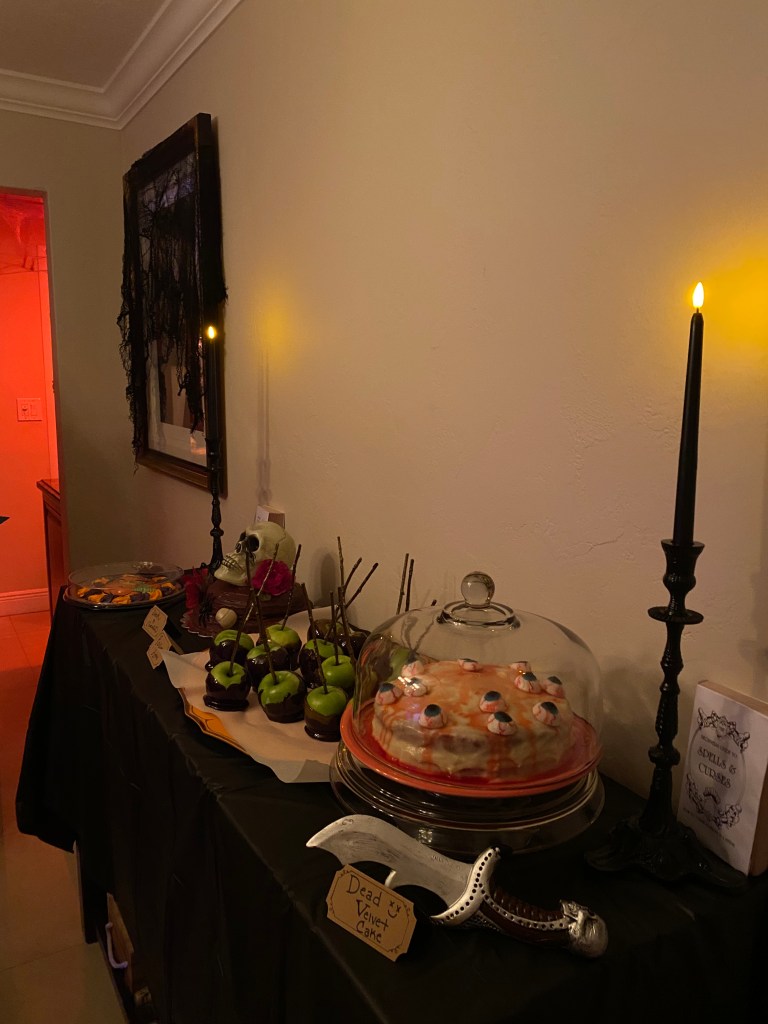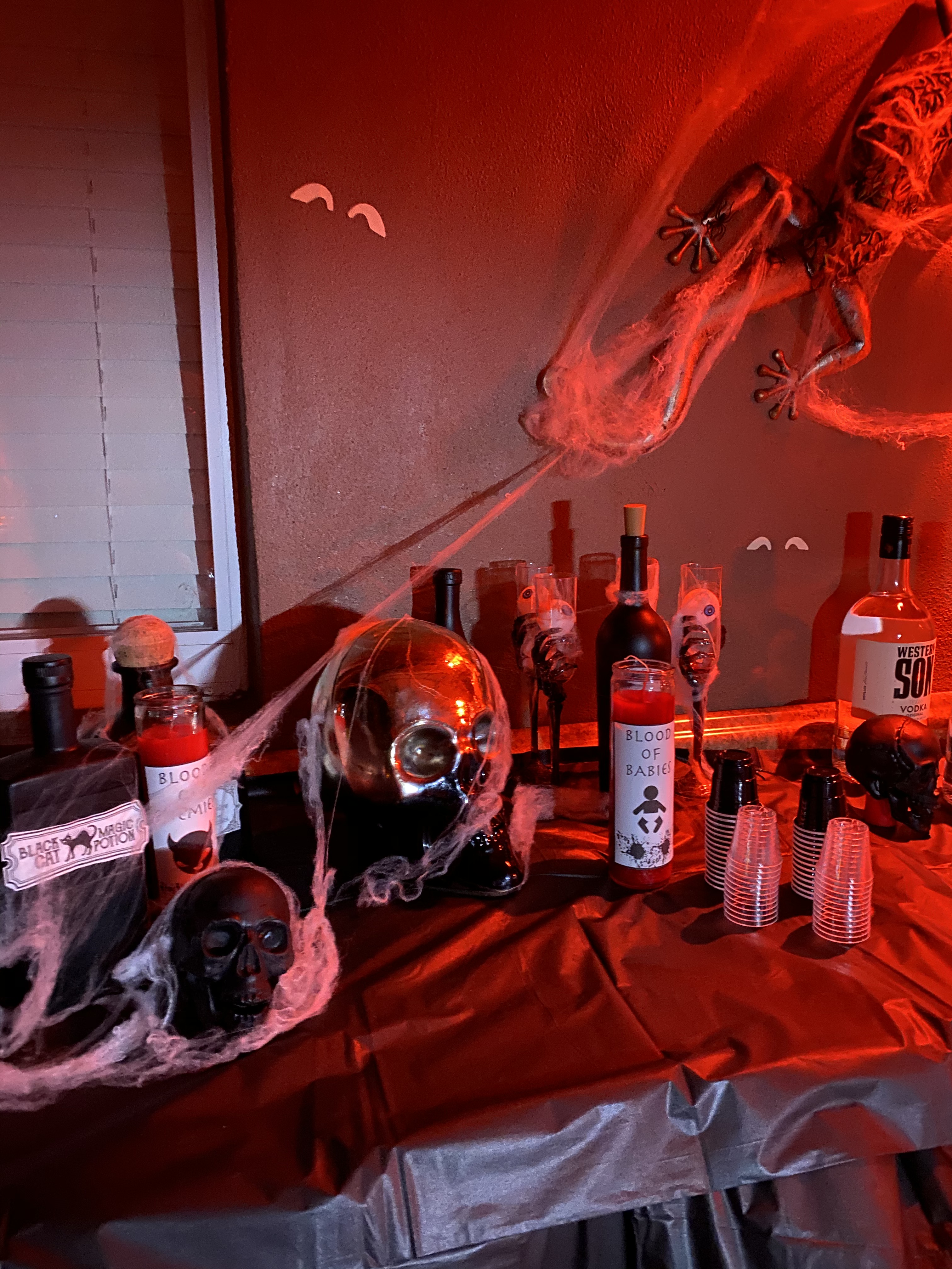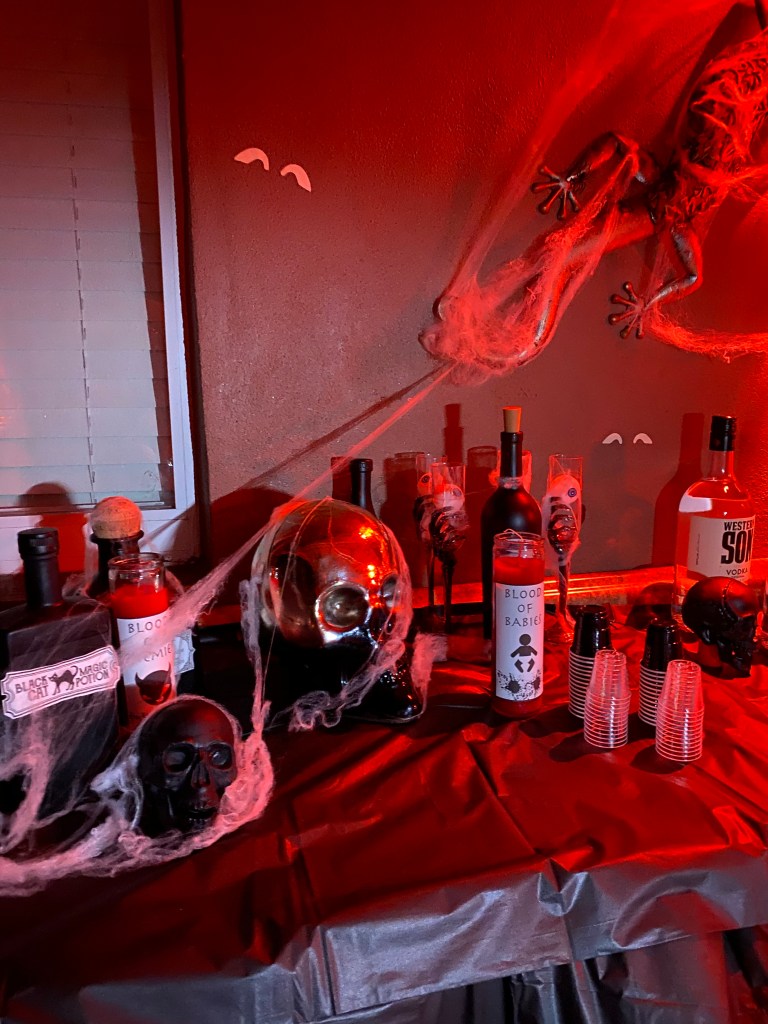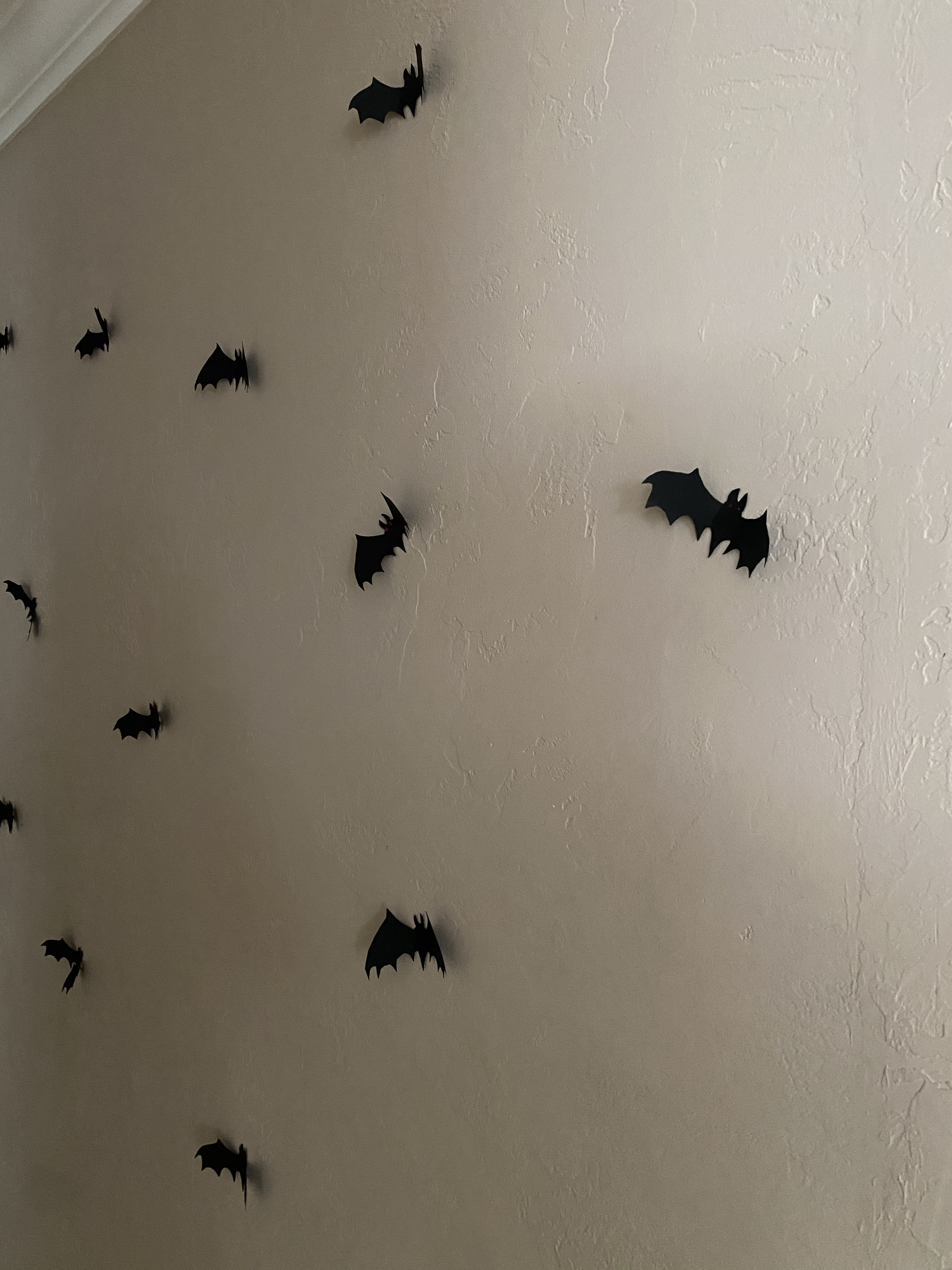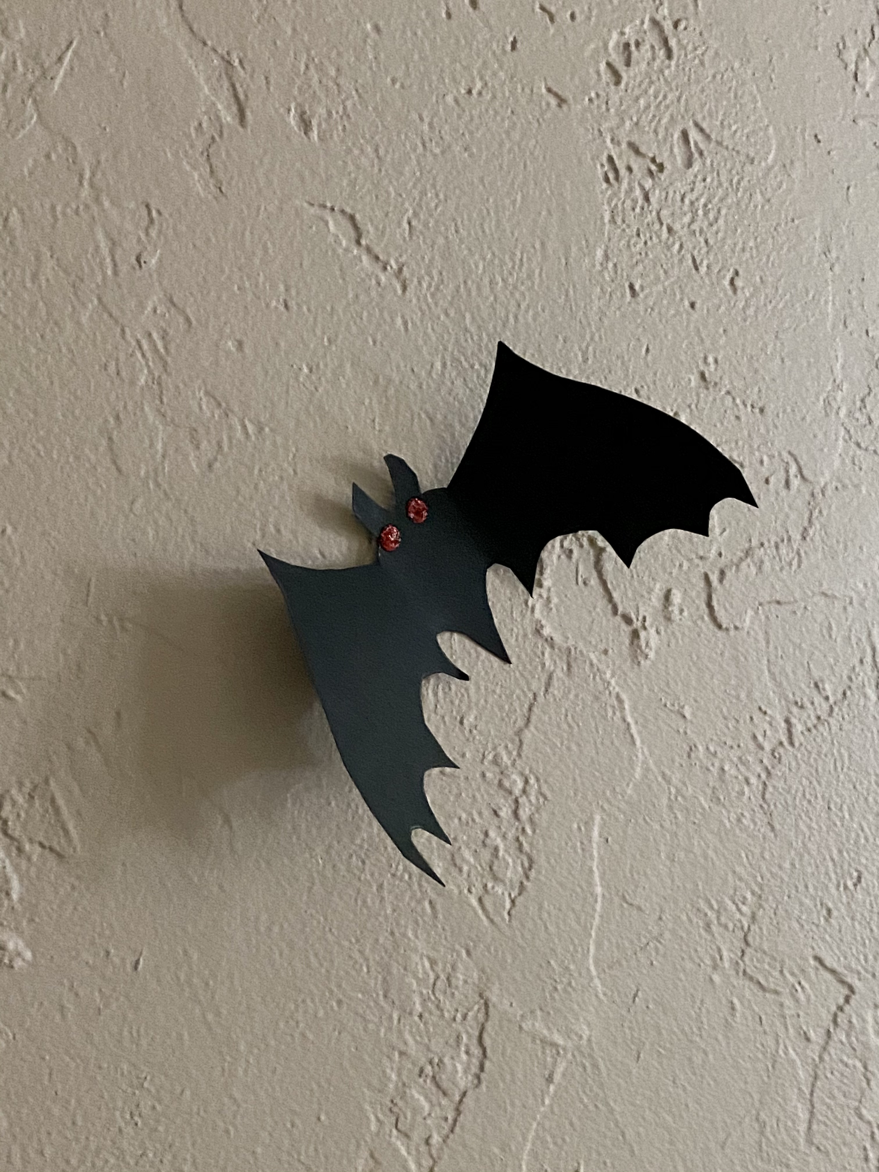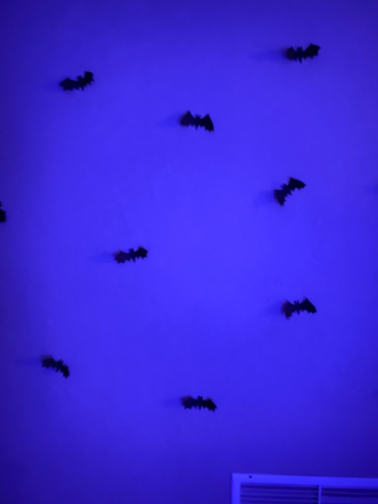 This was my mom’s favorite part. They are super easy to make. What I did was create a bat stencil and trace it on to the black paper. Then, I cut it out and put the red eyes with red glitter. I easily placed them on the wall with museum putty (used this for the cobwebs, as well).