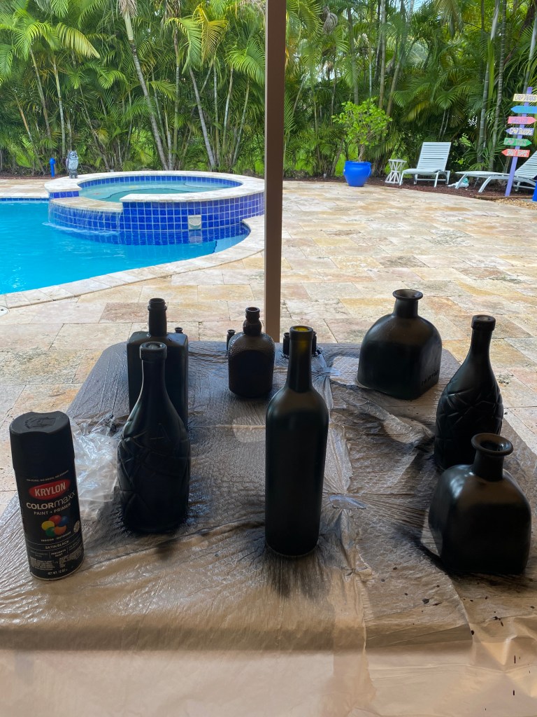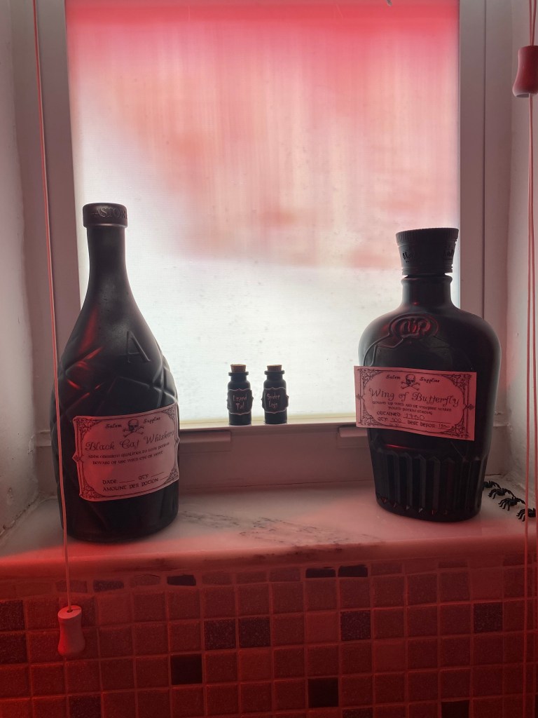 Spray Painted Potions with labels (& candles)