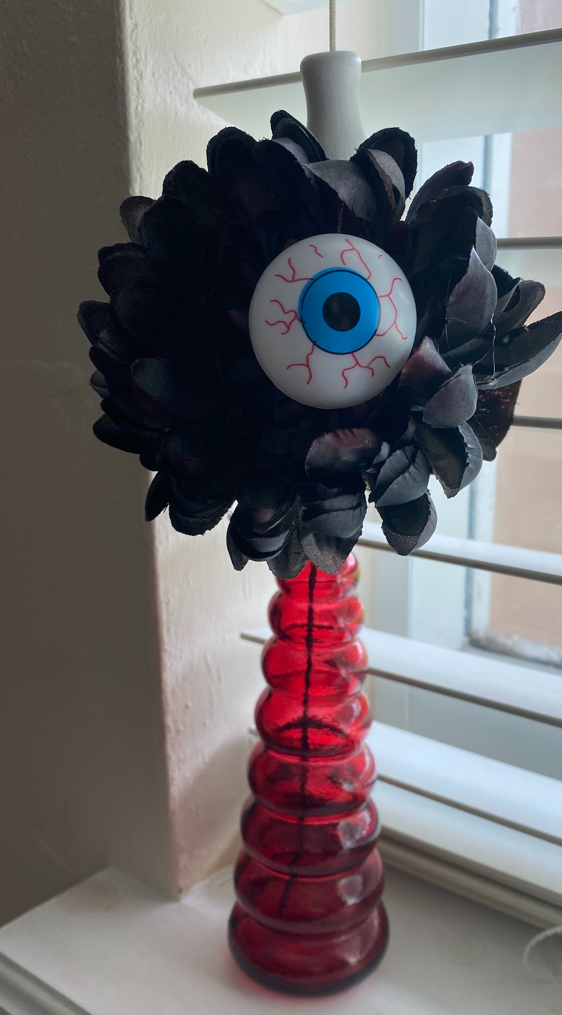 This is easy and looks really cool. Buy cheap flowers from the dollar store (spray paint them if they are not the right color), and hot glue eyeballs in the middle.
