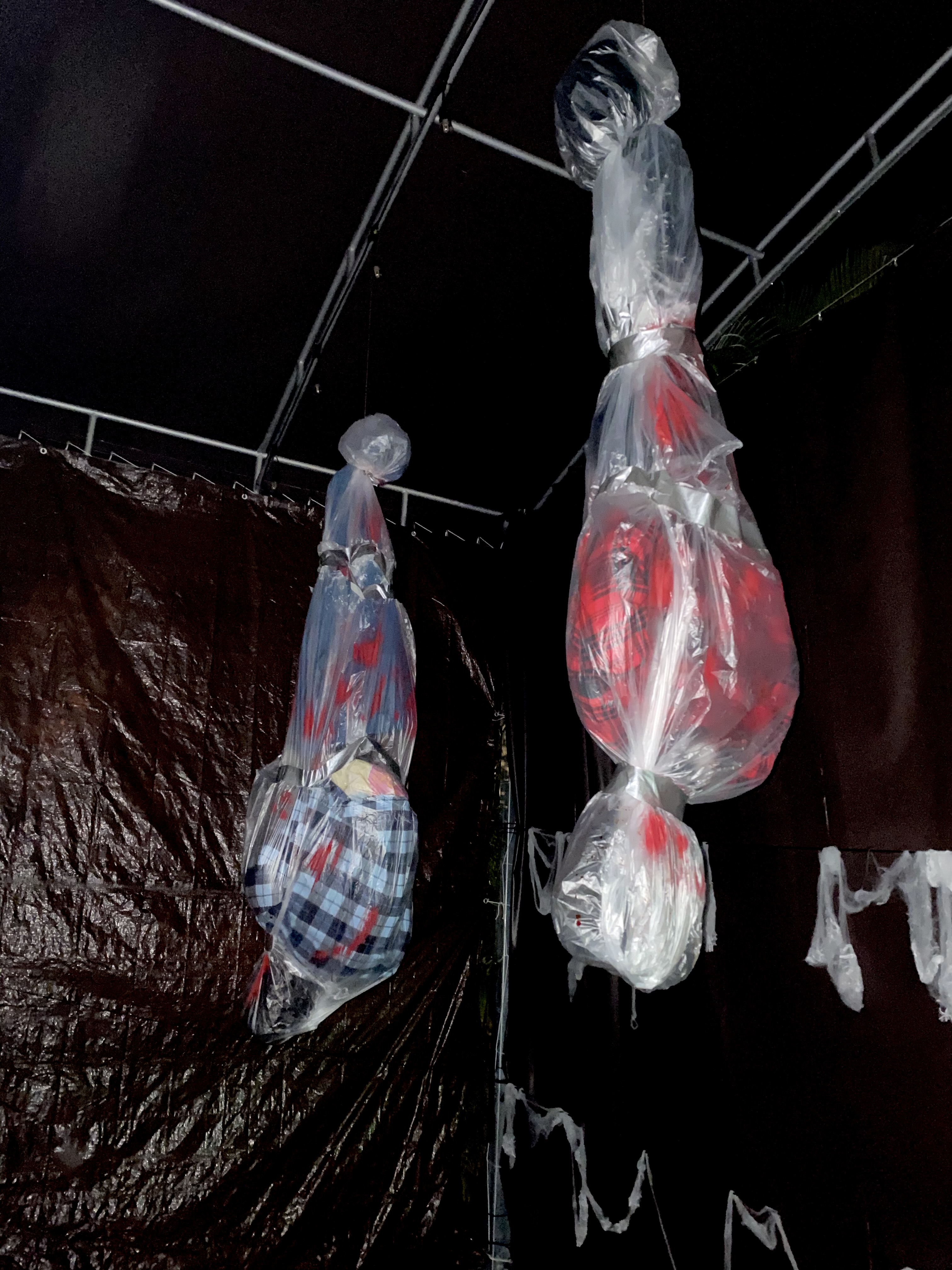 I used plastic bags for the body and head and then wrapped it with a black tablecloth. They are being held up by a pole we hammered to the ground (make sure whatever you use has a sharp end).