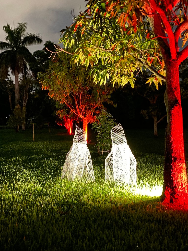 I used chicken wire to form the dresses and then spray painted them white (glow in the dark spray did not work for me).