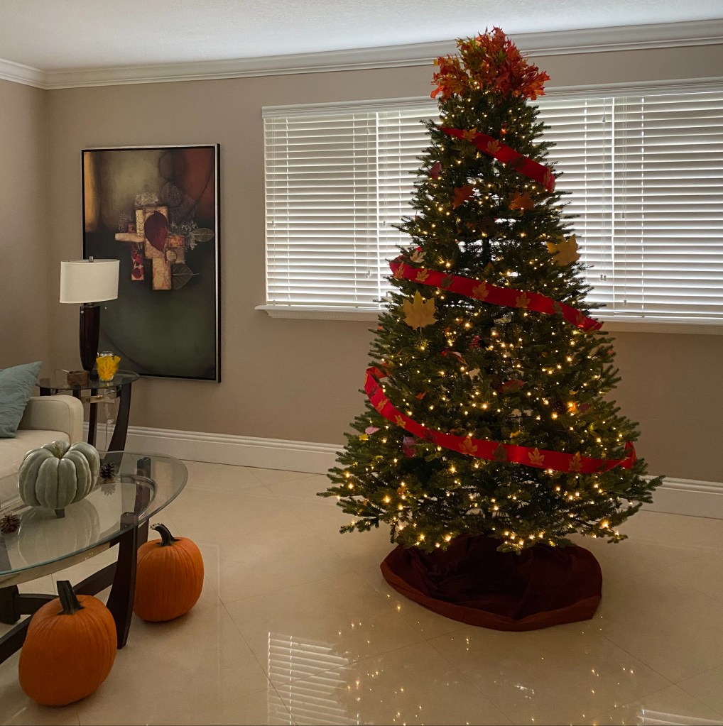 Since a tree during Christmas time brings so much joy, I wanted to utilize it for Thanksgiving (my favorite holiday). I decorated the tree in a super easy fall theme by gluing fall leaves to a velvet Christmas ribbon, placing leaves/pinecones on the tree, and positioning leaves from Publix on the top (instead using a Christmas bow).