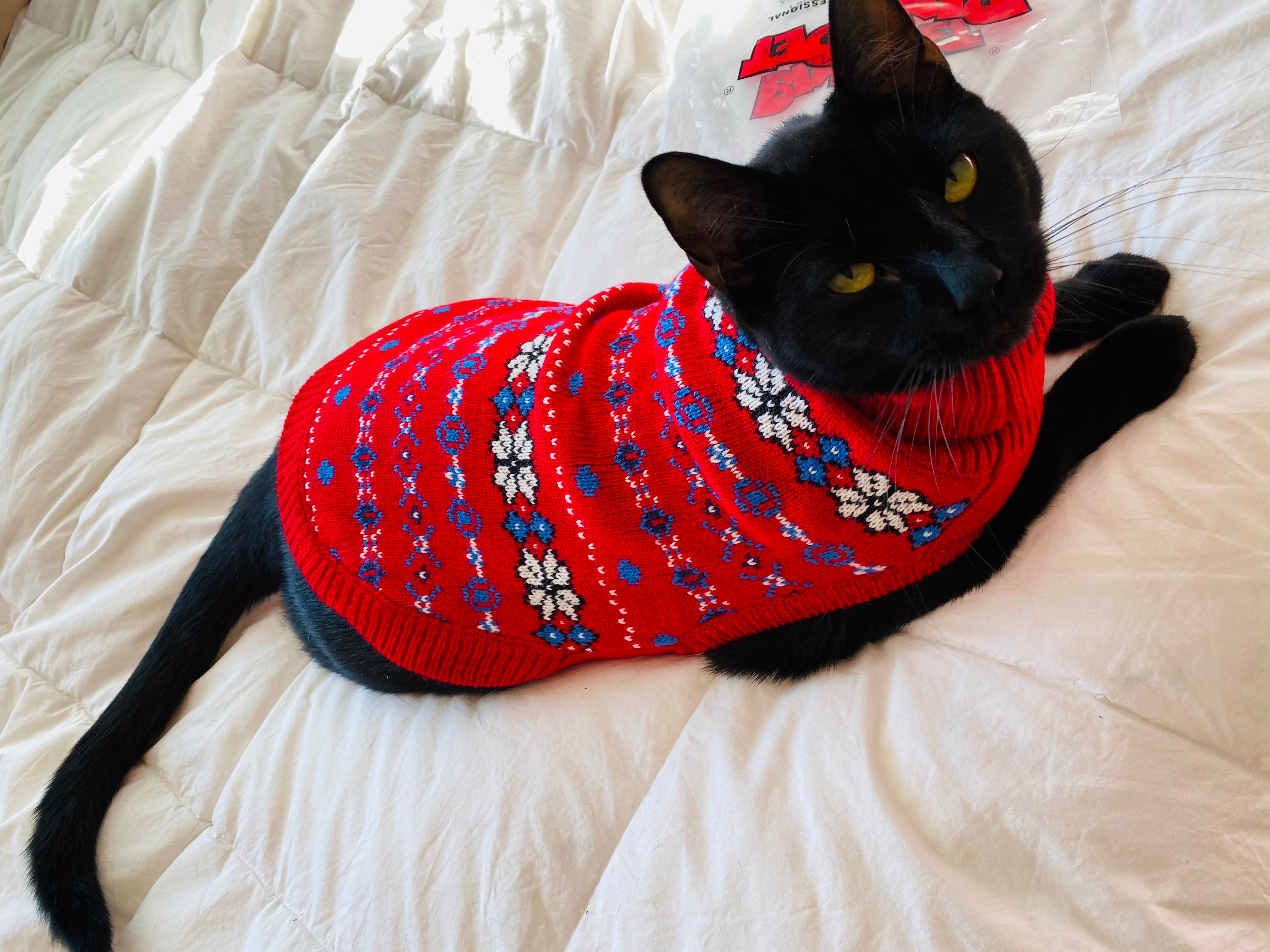 He absolutely loves the sweater and it fits purrrrfectly.