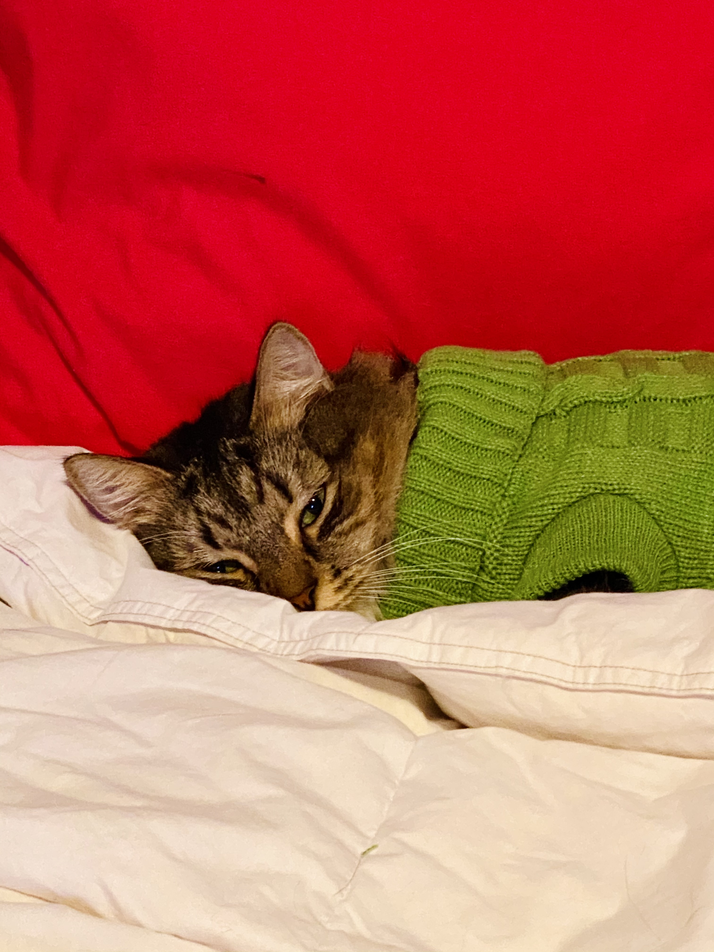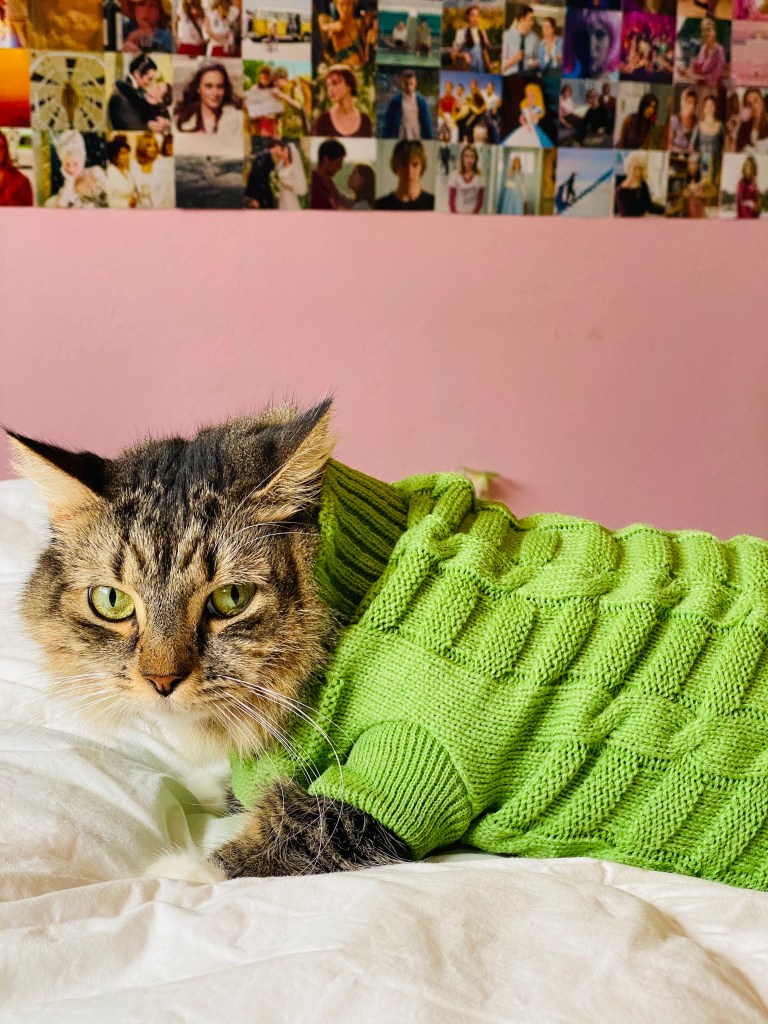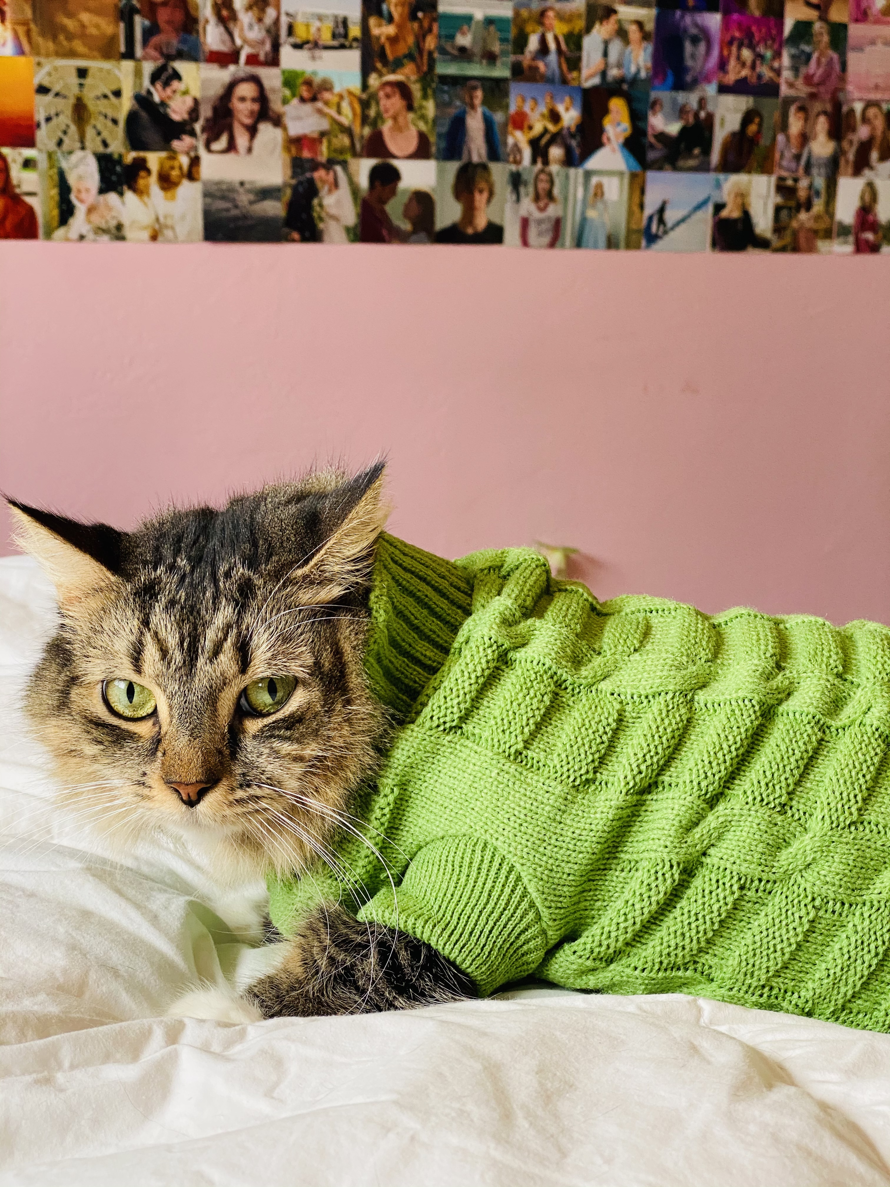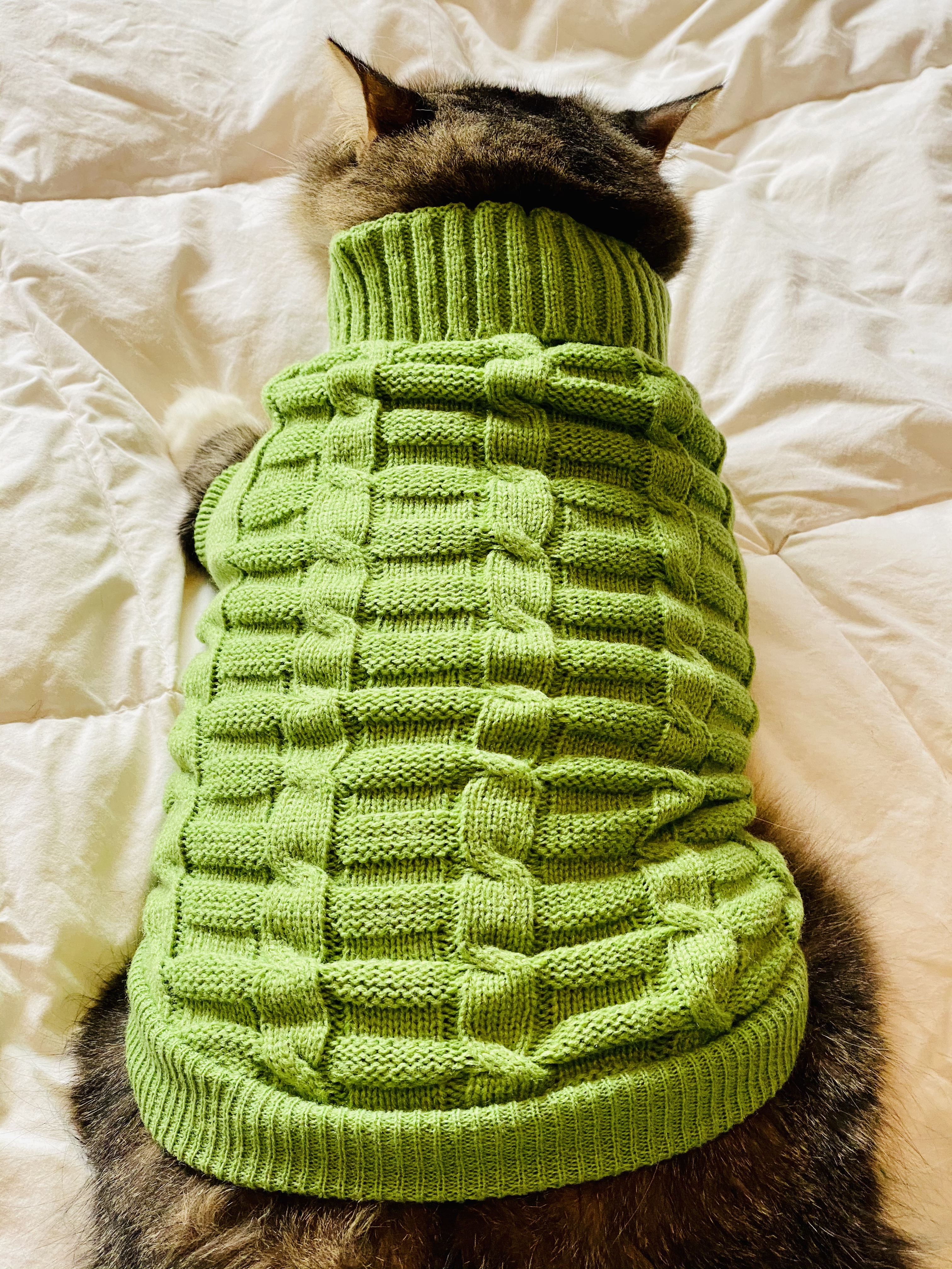 I never thought my cat would enjoy wearing a sweater but she does. She enjoyed it so much that she was upset when I took it off of her. I did some research on cats & sweaters and apparently they help with cat anxiety (which she has). I am so happy with this purchase. She is wearing an XL (for reference, she is about 13 lbs and very fluffy).