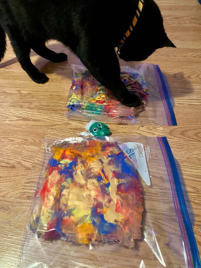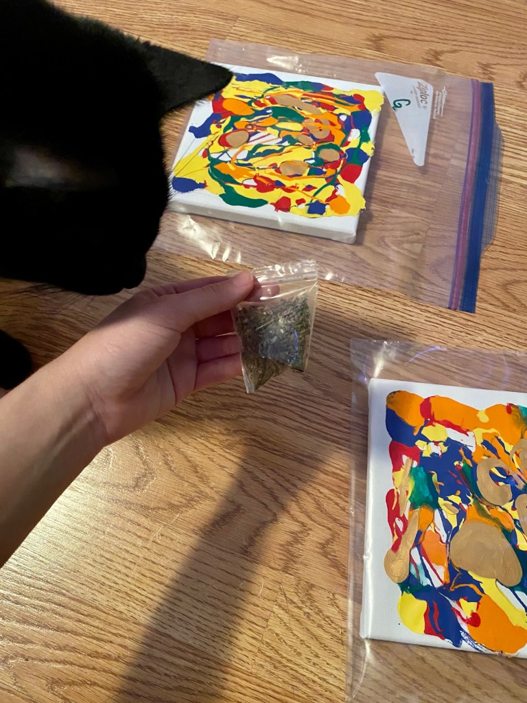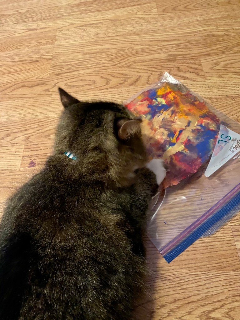 - To get your cat to “paint”, put cat food, catnip, and/or a cat toy on top of the Ziploc bag