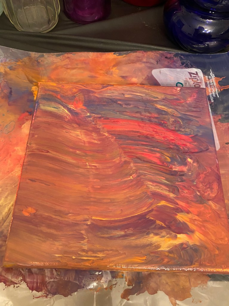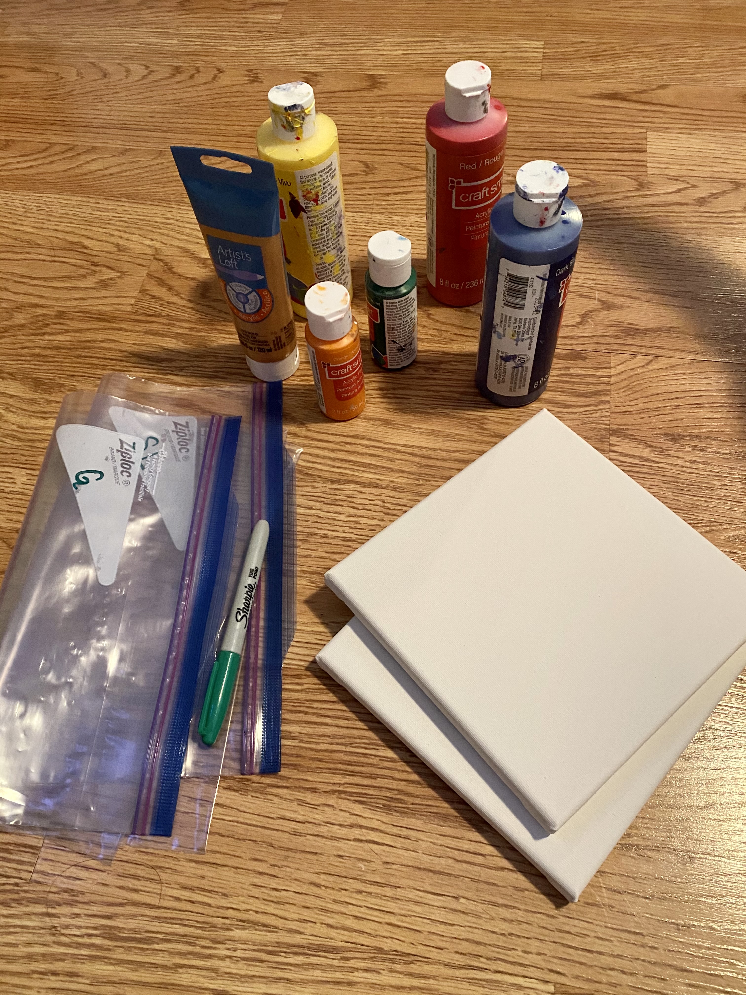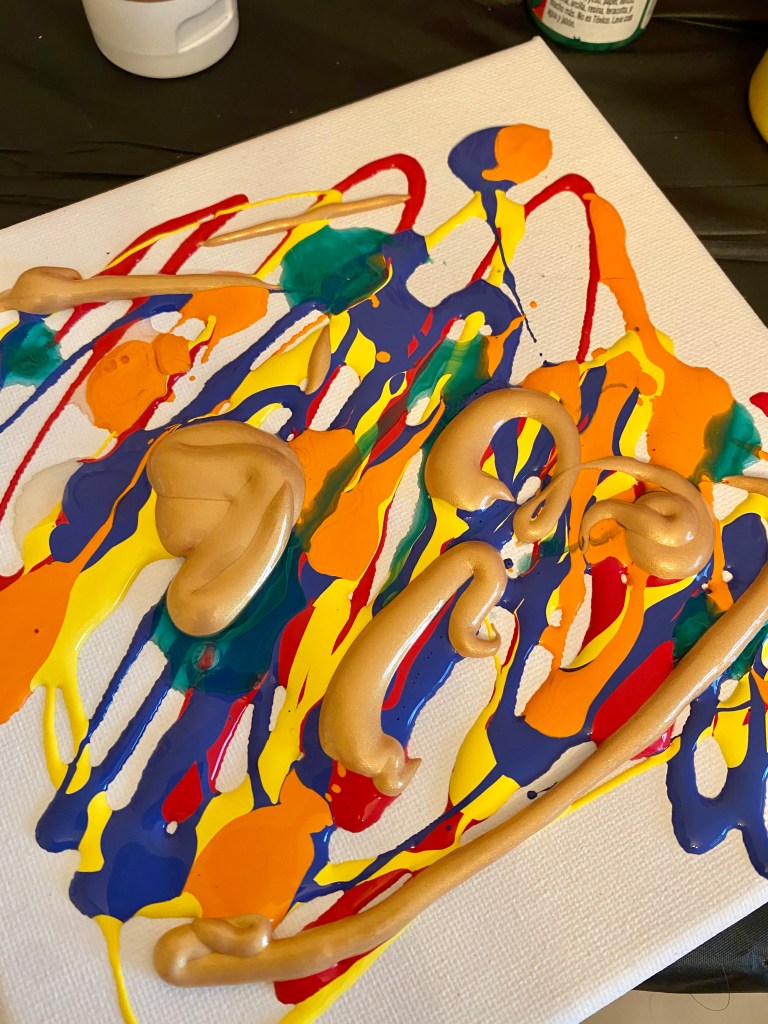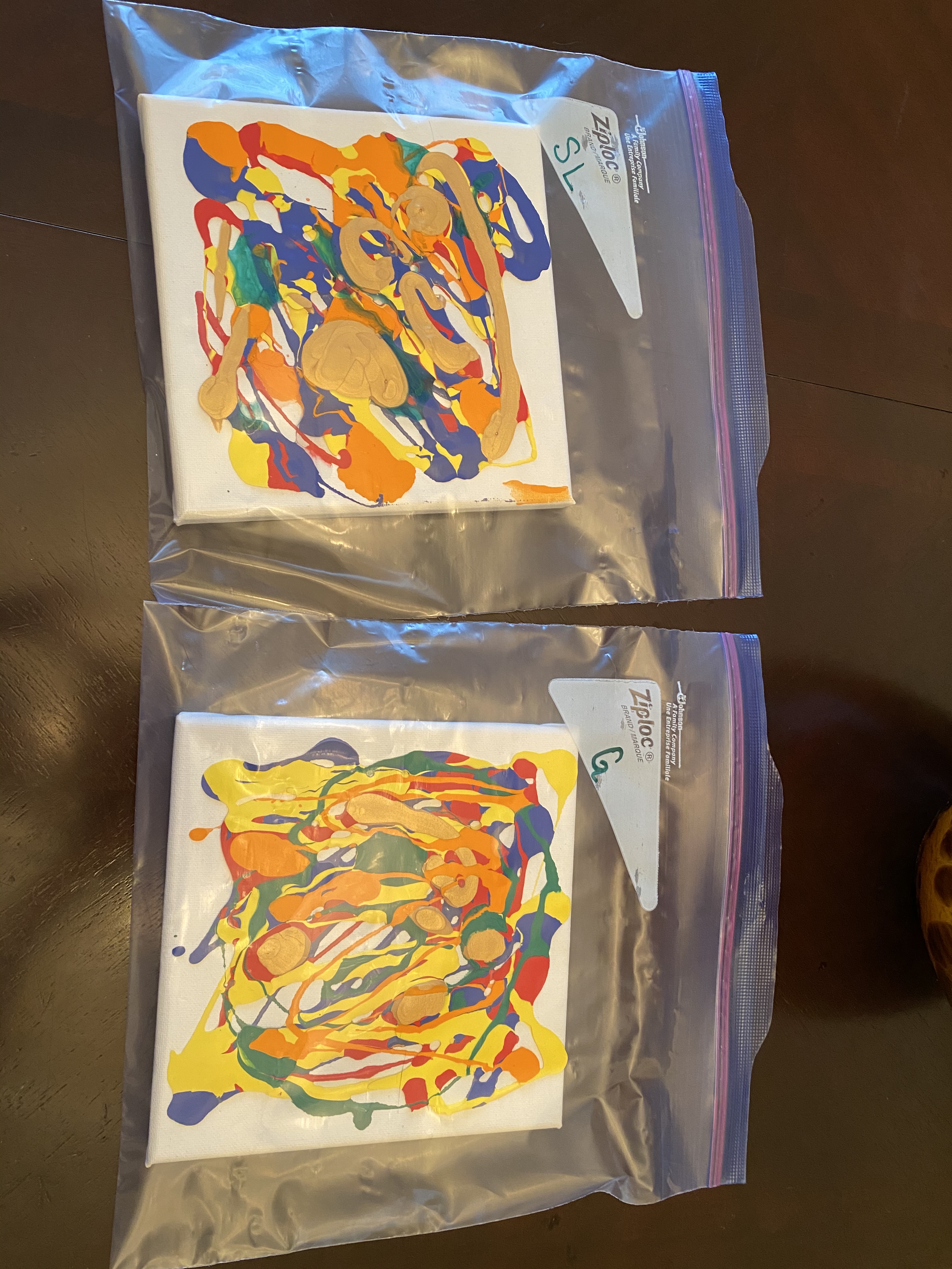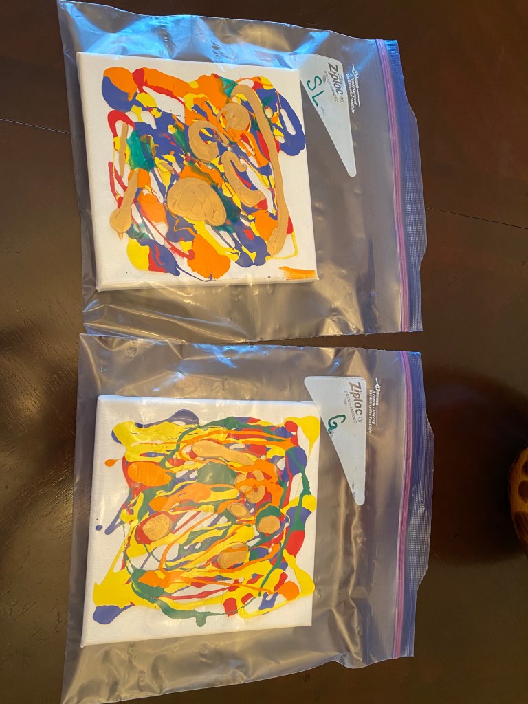 - Pour different colors onto the canvas, and then put the canvas into the Ziploc bag