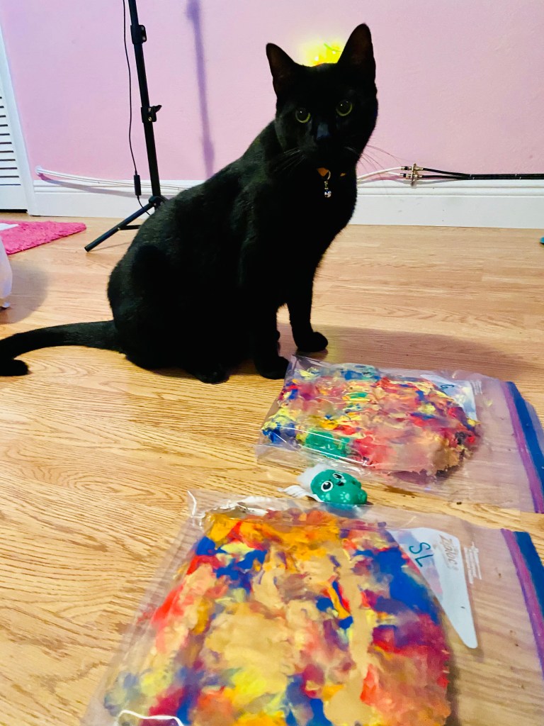 One of my cats actually participated and enjoyed it. The other one, on the other hand, needed a bit of assistance from her mother! I highly recommend this project for parents with fur babies. It is fun, and you get to keep the cute paintings that they make.