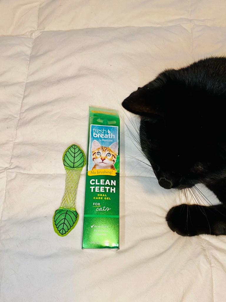 The Petstages Catnip and Dental Health Cat Toy ($2.99) is an easy way for your baby to clean their teeth and get fresh breath. Both of my cats love it and it has really helped with their fishy cat breath.