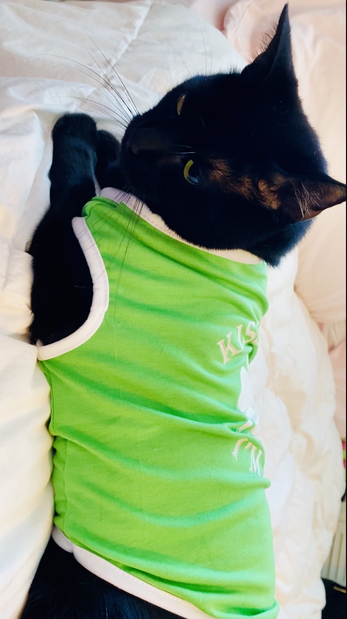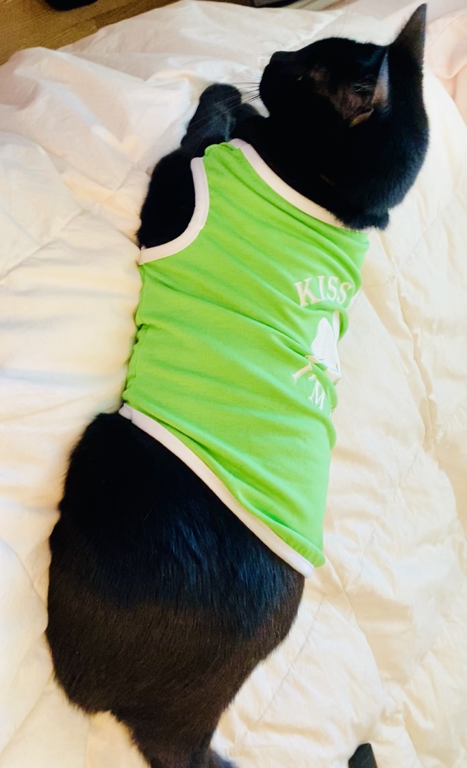 I got this shirt for my cat for his birthday (St. Patrick’s Day). I got a large for him and it fits well. It is a bit big, but the medium would have been too small. He is a 17 pound cat – yes, he is a rather large cat. He loves his new shirt and cannot wait to wear it on his special day!