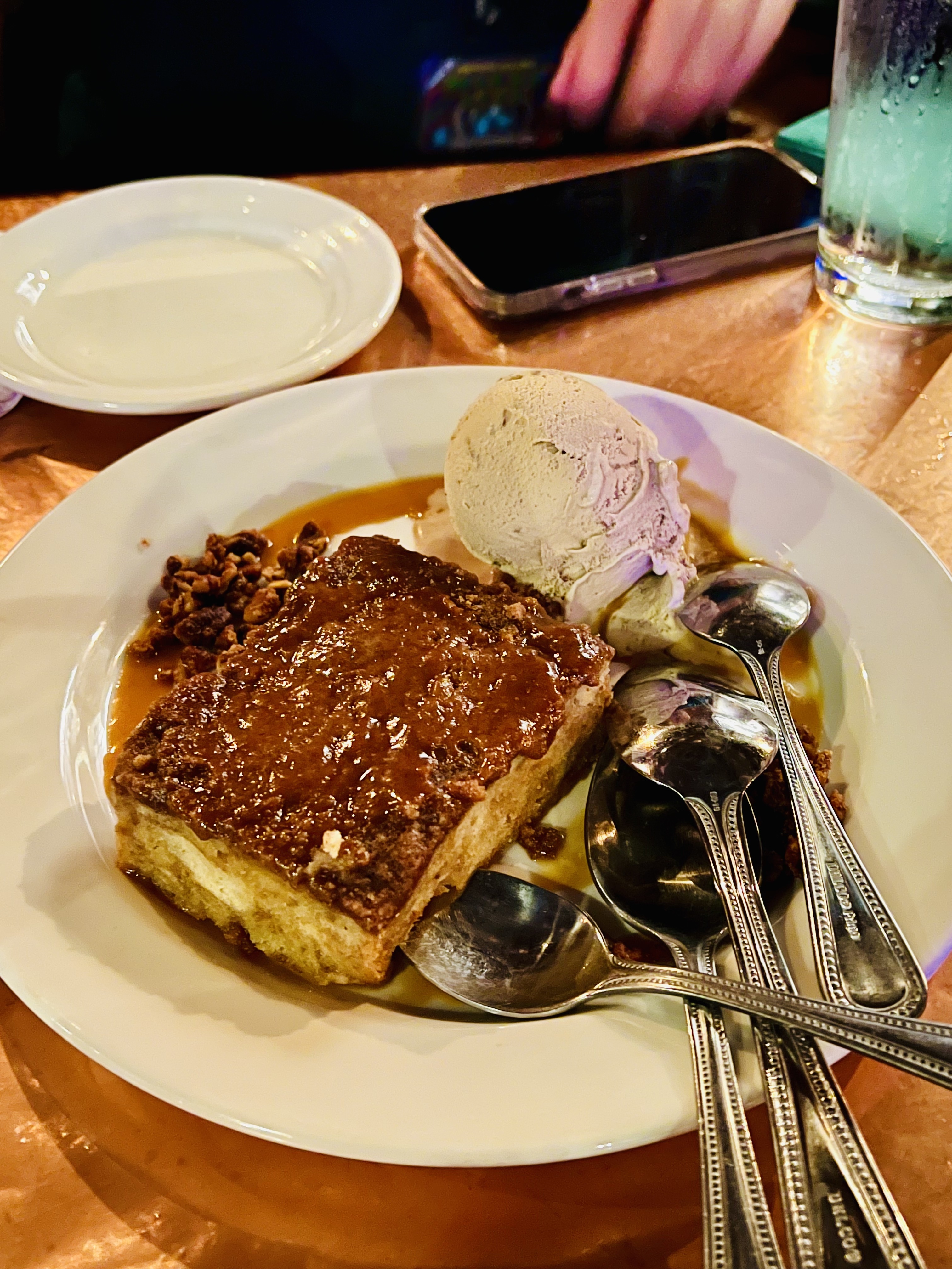 I guess we were still hungry (or wanted to continue enjoying the dueling pianos) because we had both of their desserts – Bag O’ Beignets and Bread Pudding. The Beignets were not as good as the ones in the park, but the bread pudding was amazing.