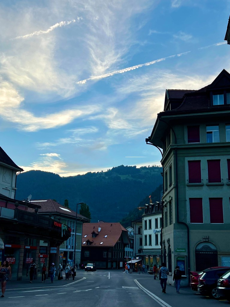 I was blown away by the view of the mountains here at Interlaken (spoiler alert, won’t be the last time I am blown away by the view here in Switzerland. It is simply just the beginning, my friends). The Interlaken area was packed, and it became hard to find somewhere to eat. Eventually, I found one – Brasserie 17 (also a hostel). To drink, I had a Leffe Blonde and loved it. For dinner, we shared chicken satay, fondue, chicken wings, and ribs. It was all good; my favorite was the chicken satay. After dinner, we got some gelato (the cherry and chocolate gelato hit the spot), sat on a bench in the park area, and attempted to commit to memory the view of the mountains.