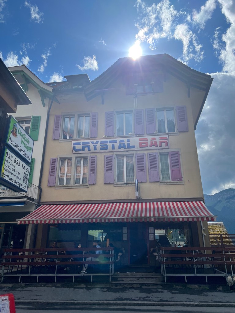 After exploring Lauterbrunnen, we took a train to Wengen, a Swiss Alpine village in the Bernese Oberland region. The view got even better in Wengen (didn’t know that was possible). Naturally, it was cooler up here (Elevation: 4,180′). When it started to rain, we took the opportunity to hide out at the closest spot, which happened to be the Crystal Bar. The warm bar served as a great stop to avoid rain and savor some beers and food.