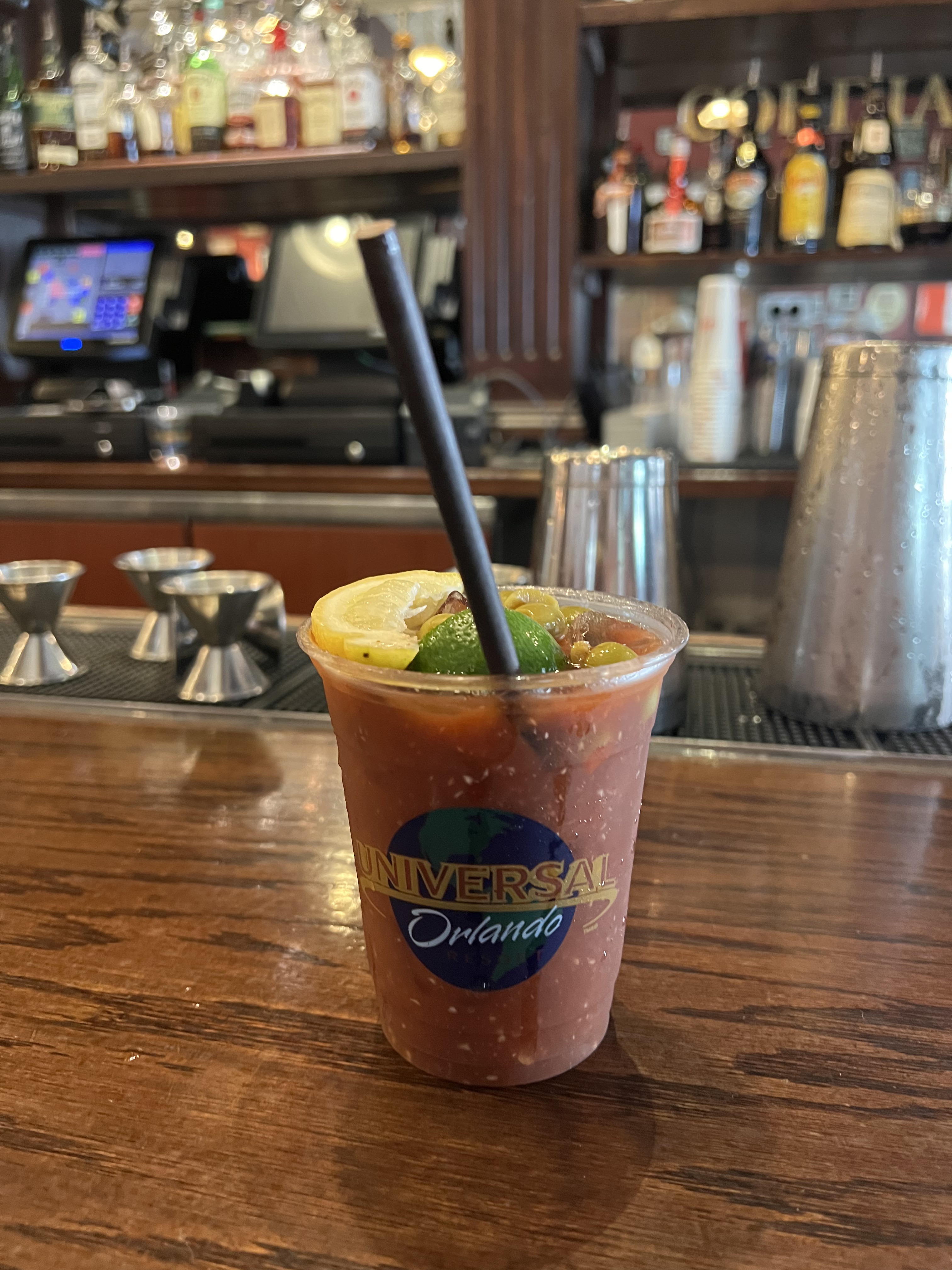 I have written multiple times about Universal’s excellent Bloody Marys during Mardi Gras season. This time, I had one at Finnegan’s Bar & Grill (a traditional, full-service Irish pub is re-created on the “New York streets” of Universal Studios). Finnegan’s is the best spot for a drink within the parks. The bartender made us a flavorful Bloody Mary that surely hit the spot. She took her time to make them perfect!