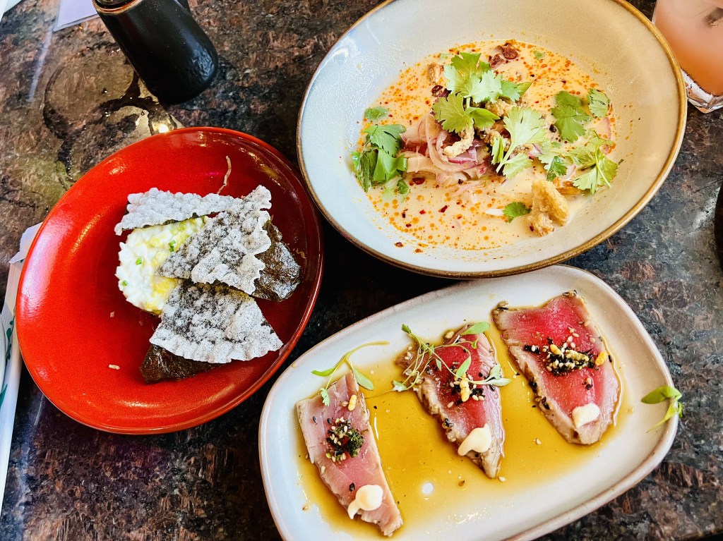 Cold tapas I had: Tuna Tartare (top left), Ceviche (top right), and Tuna Tataki (bottom).