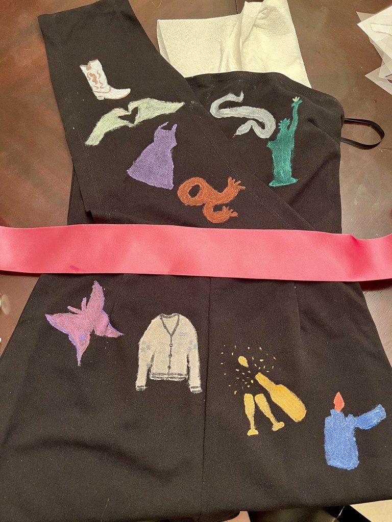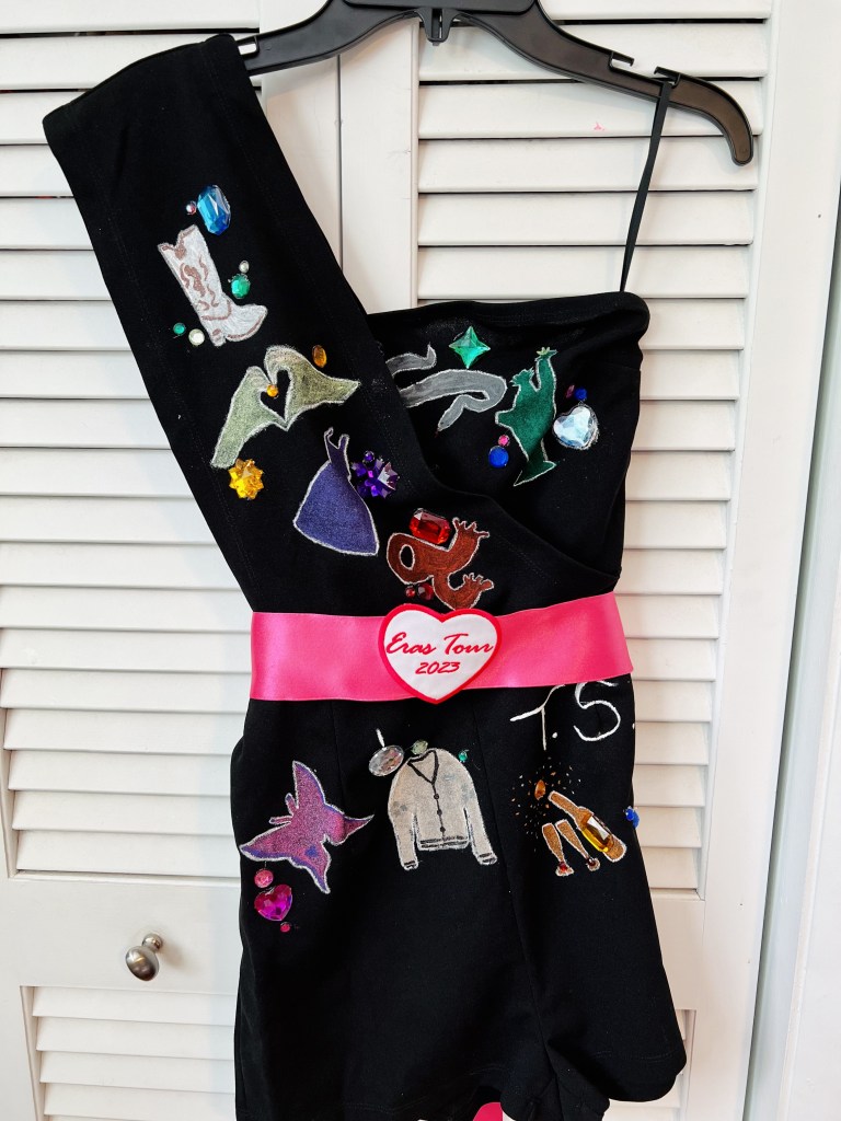 My last step was creating the belt. I cut some pink ribbon and ironed on an Eras Tour patch I ordered from Etsy. These patches are cool because you can select which era’s design you want. I chose Lover💖.