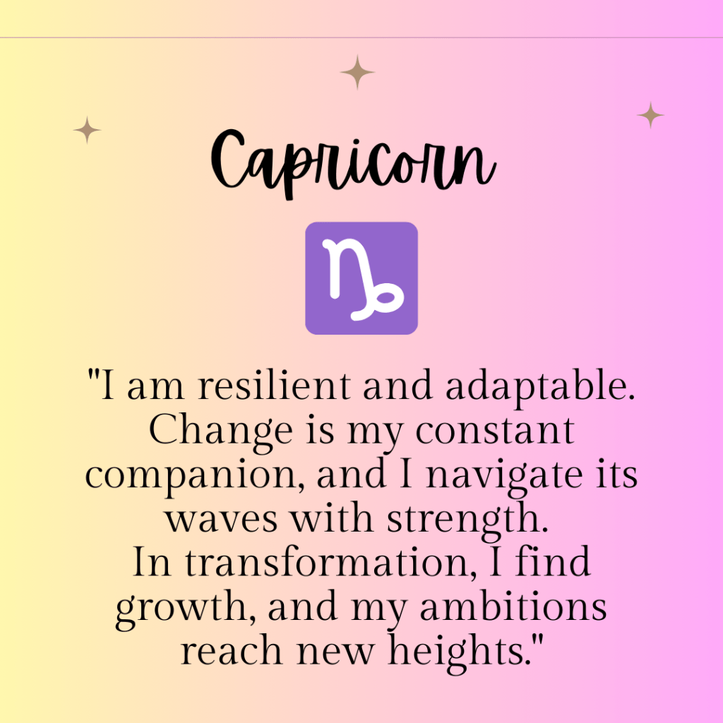 “I am resilient and adaptable. Change is my constant companion, and I navigate its waves with strength. In transformation, I find growth, and my ambitions reach new heights.”