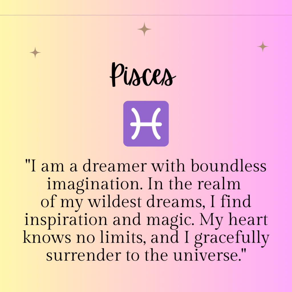 “I am a dreamer with boundless imagination. In the realm of my wildest dreams, I find inspiration and magic. My heart knows no limits, and I gracefully surrender to the universe.”