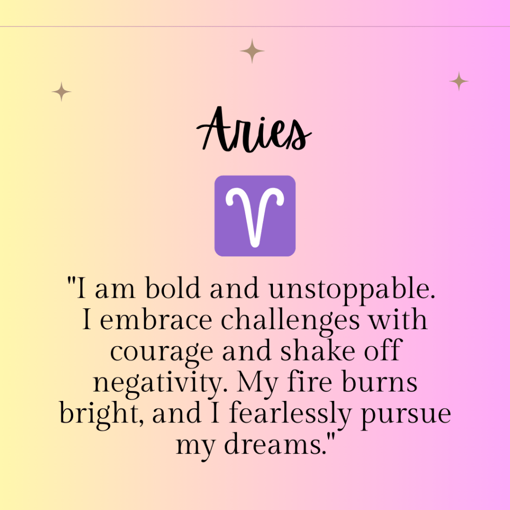 “I am bold and unstoppable. I embrace challenges with courage and shake off negativity. My fire burns bright, and I fearlessly pursue my dreams.”