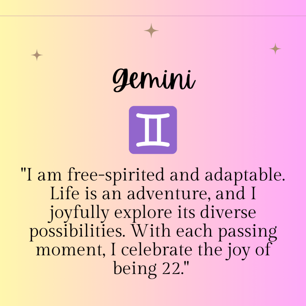 “I am free-spirited and adaptable. Life is an adventure, and I joyfully explore its diverse possibilities. With each passing moment, I celebrate the joy of being 22.”