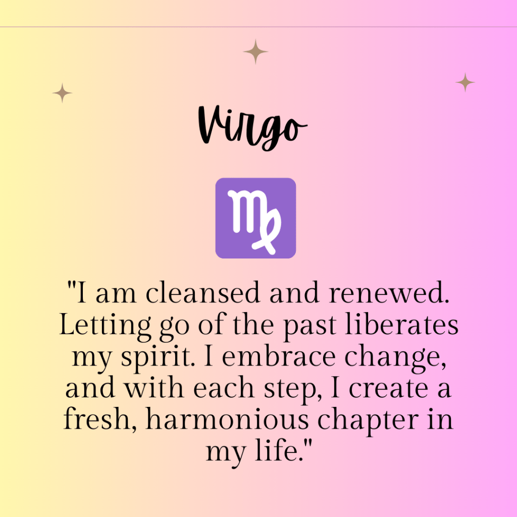 “I am cleansed and renewed. Letting go of the past liberates my spirit. I embrace change, and with each step, I create a fresh, harmonious chapter in my life.”